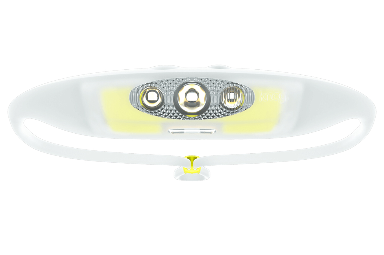 Medical-grade silicone body and strap, set-and-forget toggle, multiple light modes each with four brightness settings, user-customisable light settings, downlight for reading, USB-rechargeable, IP67. Output 400 lumens Run time 5-105hr Range 100m Weight 90g. www.knog.com