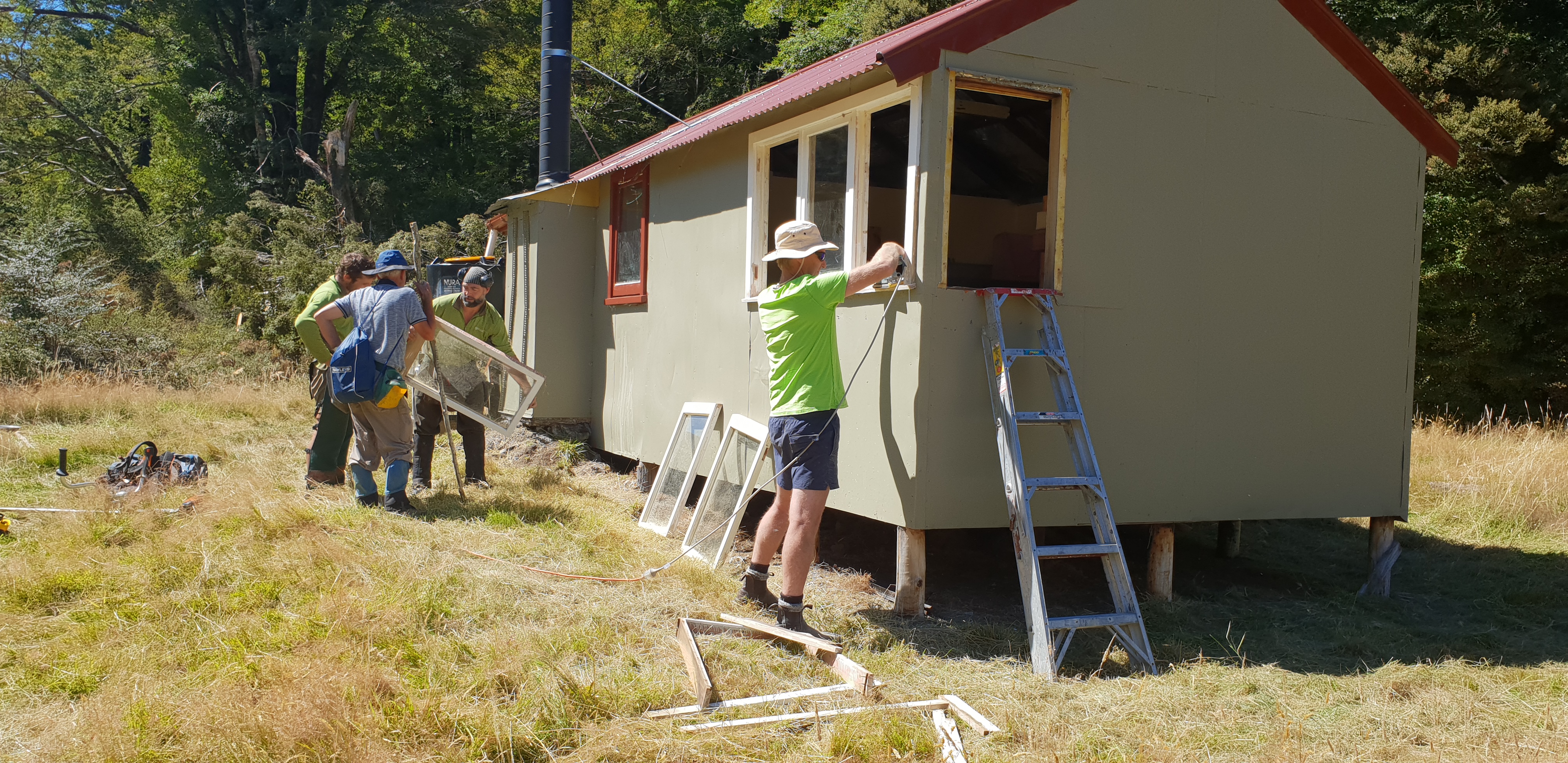 The project, which will see four huts renovated by year’s end, started in March with Three Mile Stream Hut and Top Hope Hut in Canterbury’s Lake Sumner Forest Park.