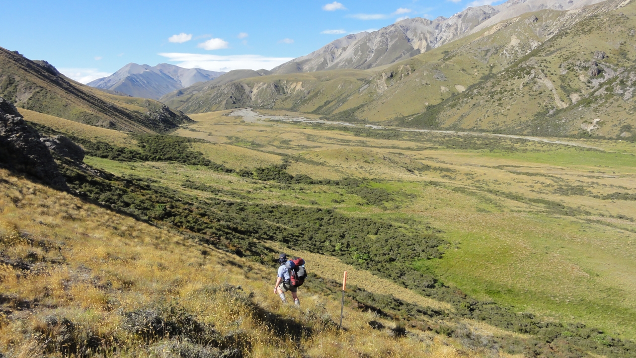 With time on our side, we had a casual start the next morning before heading off around the Manuka Range – first following the West Branch; meeting the watershed and then following the course of the East Branch of the Stour River. Initially, matagouri and swampy conditions made progress slow but once on the low tussock flats we made good time. Waist-high grasses and swampy conditions ahead combined with intermittent matagouri-filled gullies then persuaded us to leave the relative plains to try our luck on the true right side of the river – but this proved even more challenging with slow painful progress up and down the steep sides of the Manuka Range in a vain attempt to avoid the worst of the matagouri and spainiard.