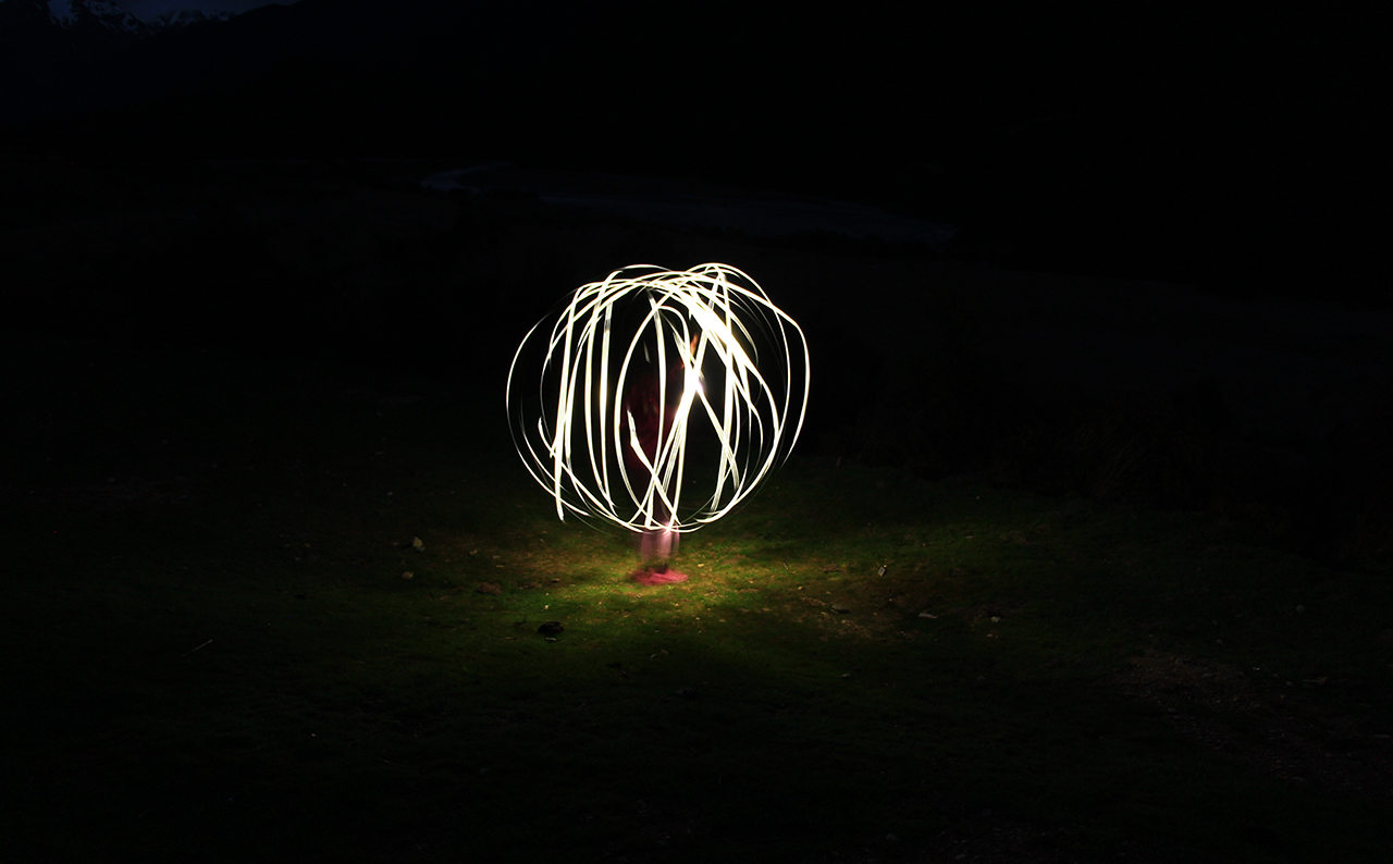 If you have a camera that has the ability to take long-exposure shots, try this trick: when it gets dark, fix your camera on a tripod or steady surface, change the settings to long-exposure (shutter speed of at least 8 seconds), and then use your headlamp to ‘paint’ a word or pattern in the air. The slower the shutter speed, the more time you’ll have to paint your message.