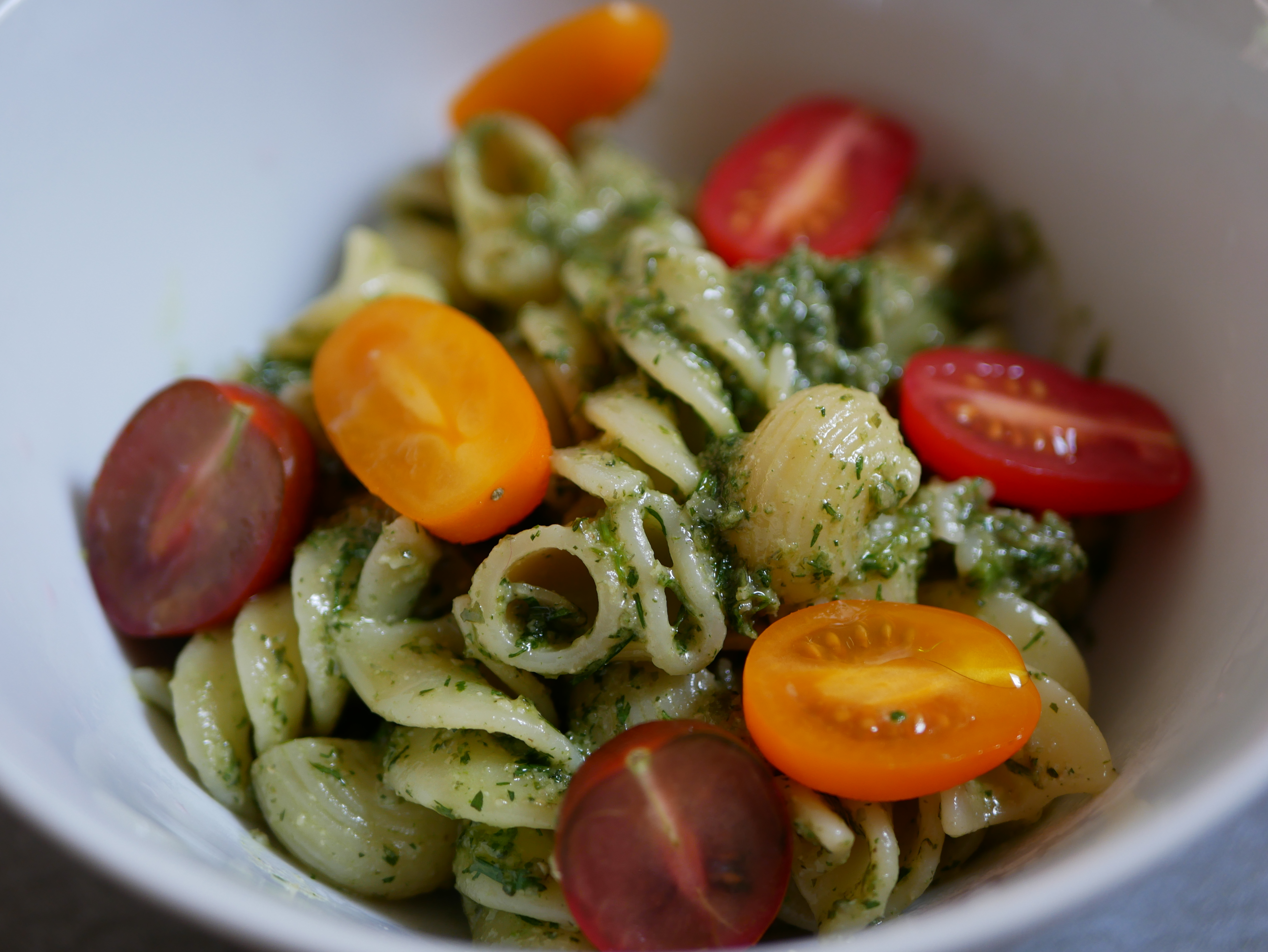 Add a little extra oil if the mixture seems dry. To assemble in the field, chop one punnet-full of cherry tomatoes in half and stir through cooked pasta with the pesto.