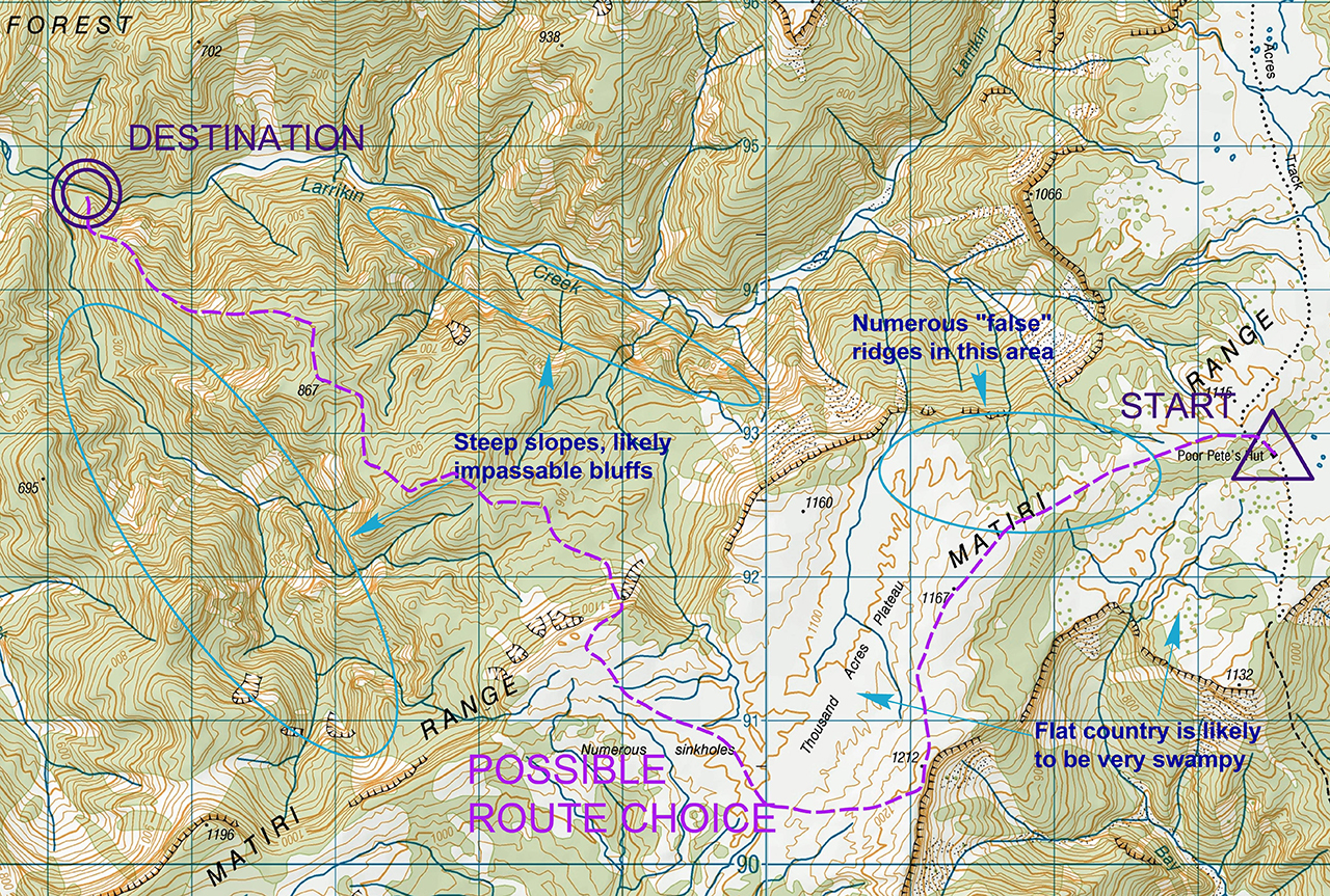 To avoid confusion, the best features to use are usually contour features such as ridgelines, gullies and hill tops. But be forewarned; while impassable features such as cliffs, terraces and slips are usually marked on the map with ‘toothed’ black lines, these barriers are often left unmapped in remote areas. Near urban centres, you will often find that toothed black lines represent stop banks but on remote parts of Westland they may represent massive cliffs.