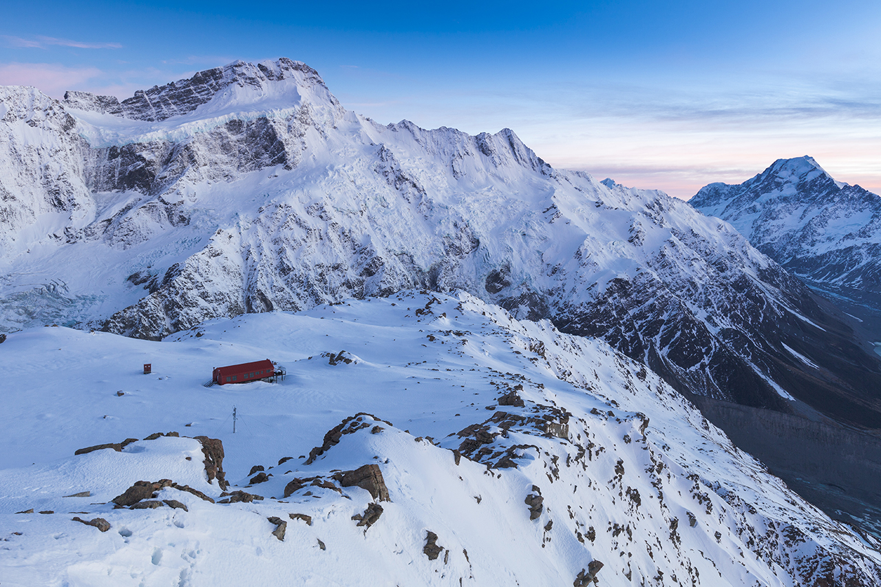Mueller Hut’s position on the Sealy Range, opposite the colossal east face of Mt Sefton, is remarkable and is one of New Zealand’s most spectacularly-sited huts, period. Venture to this location during winter and you’re in for a treat; not only is ‘New Zealand’s Highest Backpackers’ likely to be quiet, you’ll be witnessing some of the country’s highest mountains at their pictorial best under the freshness of their winter coat.