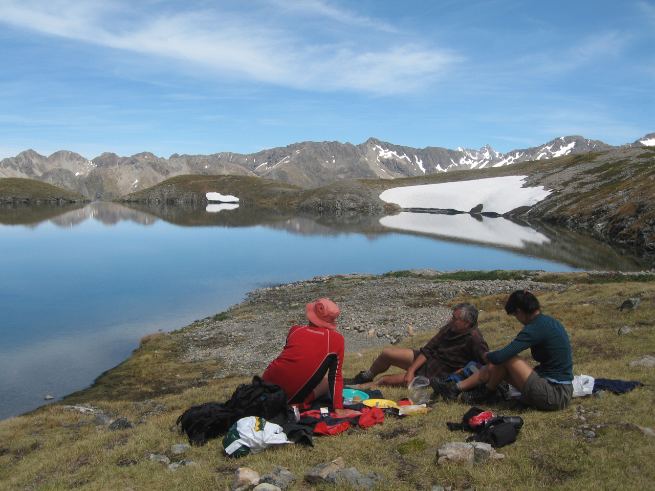 This exceptional lake captivated us for a couple of hours as we lay in the sun and imbibed the clear mountain air. The lake is fed by five pure snow-fed streams, its surface smooth and radiant with reflections. This is a sight worth seeing and will readily provide sheltered campsites for those who want to enjoy a longer stay. However, we had to descend. Ninety minutes up and sixty minutes down, the latter more difficult than the former. It was a reluctant retreat.