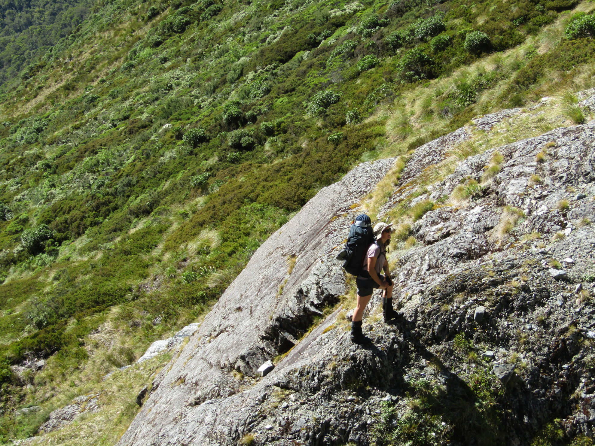 We were attempting to follow a route described in Moir’s Guide that hadn’t changed since my dog-eared 1986 copy was published. The intervening years had seen rockfall make things much more… interesting. We were climbing alongside Flower Fall, en route to Marshall Pass, in the hinterland of the Milford Track. As we kept reminding each other: this was just meant to be tramping.