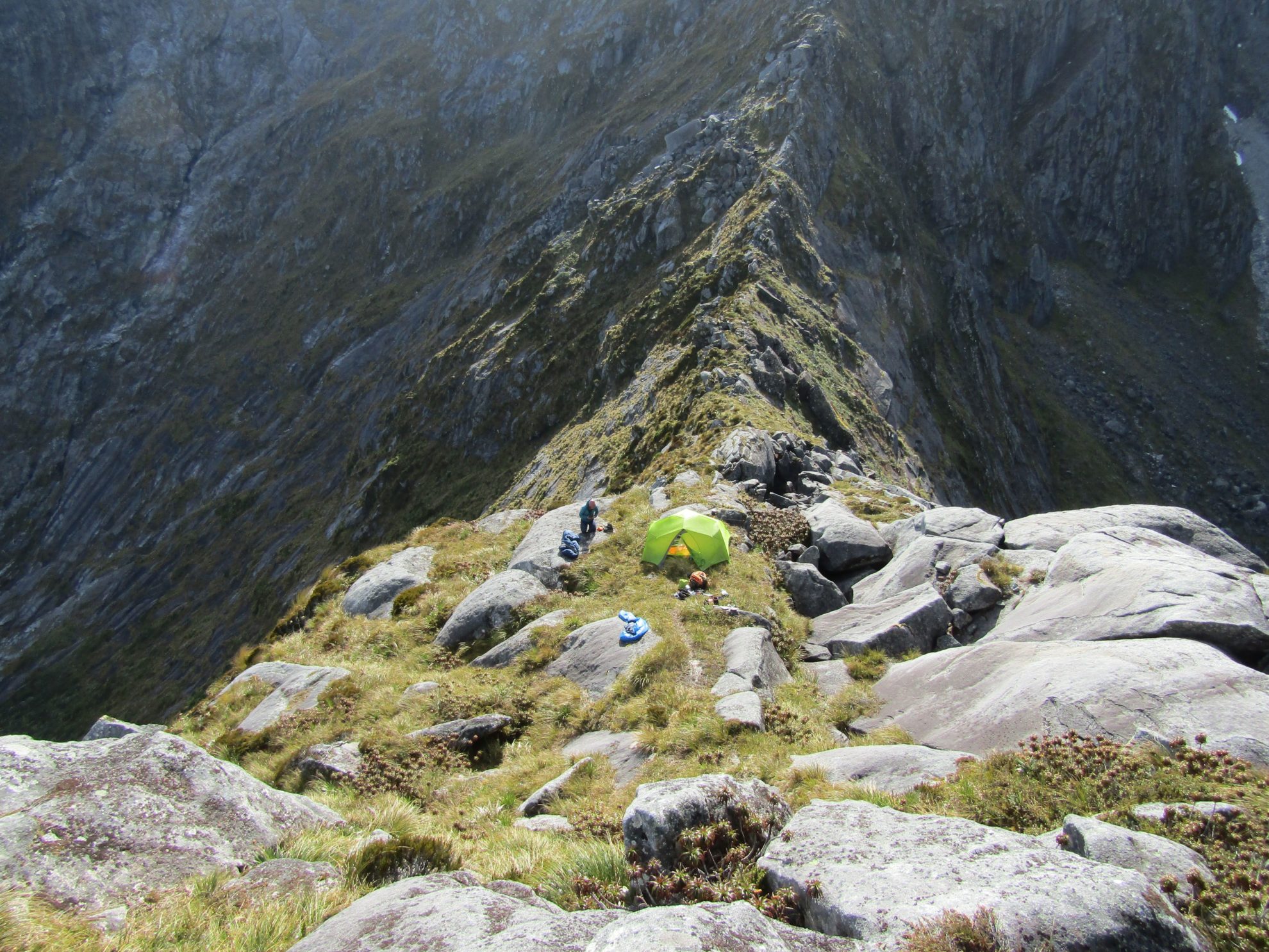 I kicked my boots into the soft gravel slope and searched for a solid handhold, feeling acutely aware of the weight of my pack and the band of cliffs below. Above was a steep pinched gut, which looked climable, but I was battling with my nerves, as was my mate. I turned back to see his eyes wide. He didn’t look keen to follow me.