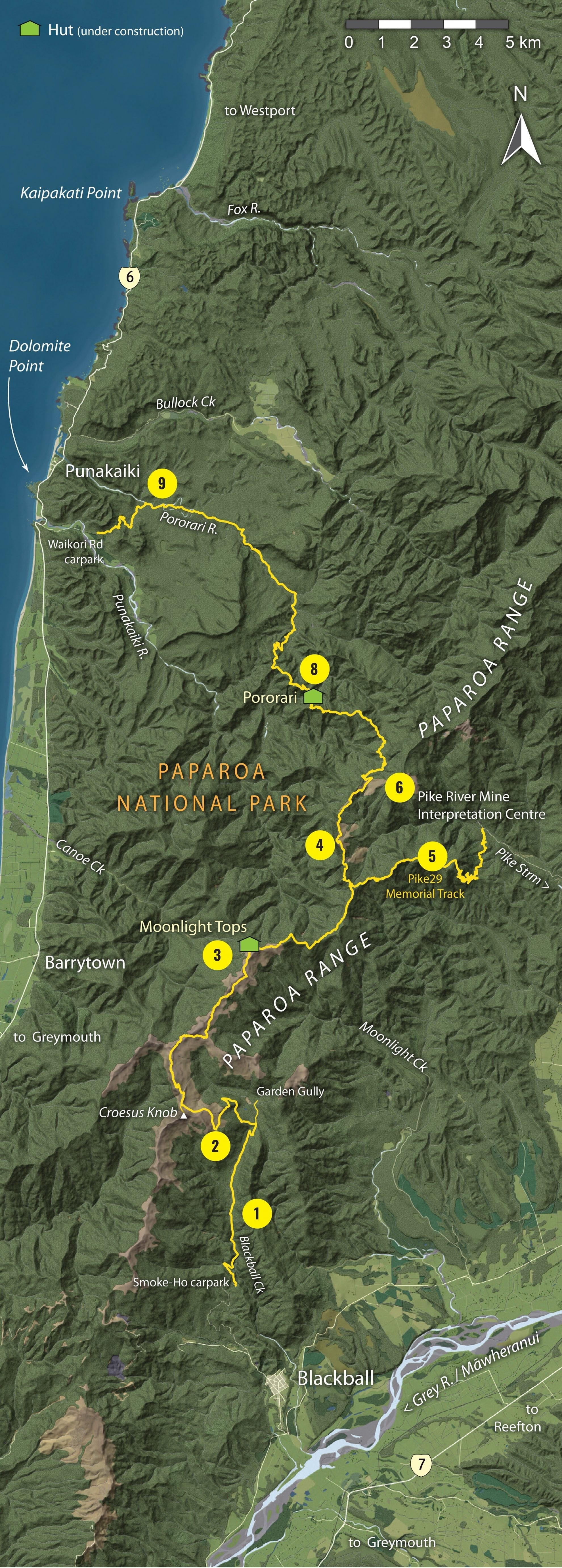 The walk crosses the Paparoa Range. Beginning in the east on the existing Croesus Track, near Blackball, it climbs to the main range and along the Moonlight Tops and then descends Pororari Valley to Punakaiki, on the West Coast. Near this end, bikers will divert via the Inland Pack Track to Waikori Road car park. The Pike29 Memorial Track is a 10.8km one-way ‘sidetrack’, climbing from the Pike River Mine site to meet the Paparoa Track north of the Moonlight Tops.