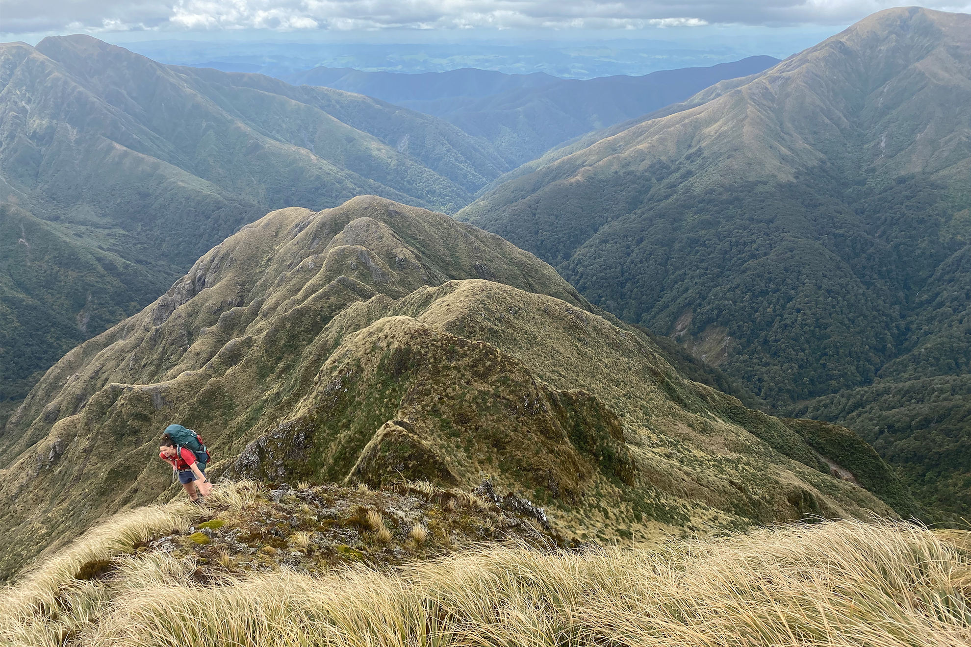 By Day Four, we’d bagged two huts and Boo was power napping during snack breaks. It was a sunny day, the clouds were racing across the sky, and we were on an unmarked ridge heading towards Herepai Hut and soon climbing high enough to feel the full force of the wind.