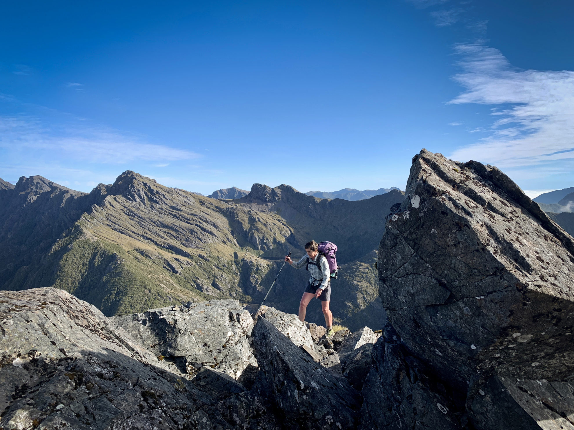 We’d heard of a party ahead planning to do the Dragon’s Teeth high route and we catch up with them at the lake edge: three South Island arborists and a Pacific Crest Trail veteran. They have a rope. We’ve decided on the low route, bypassing the jagged serrations of the teeth and passing under the Drunken Sailors. We’re rueful now about taking the easier option especially as they tell us there’s a party half a day ahead of us with two kids also doing the high route.