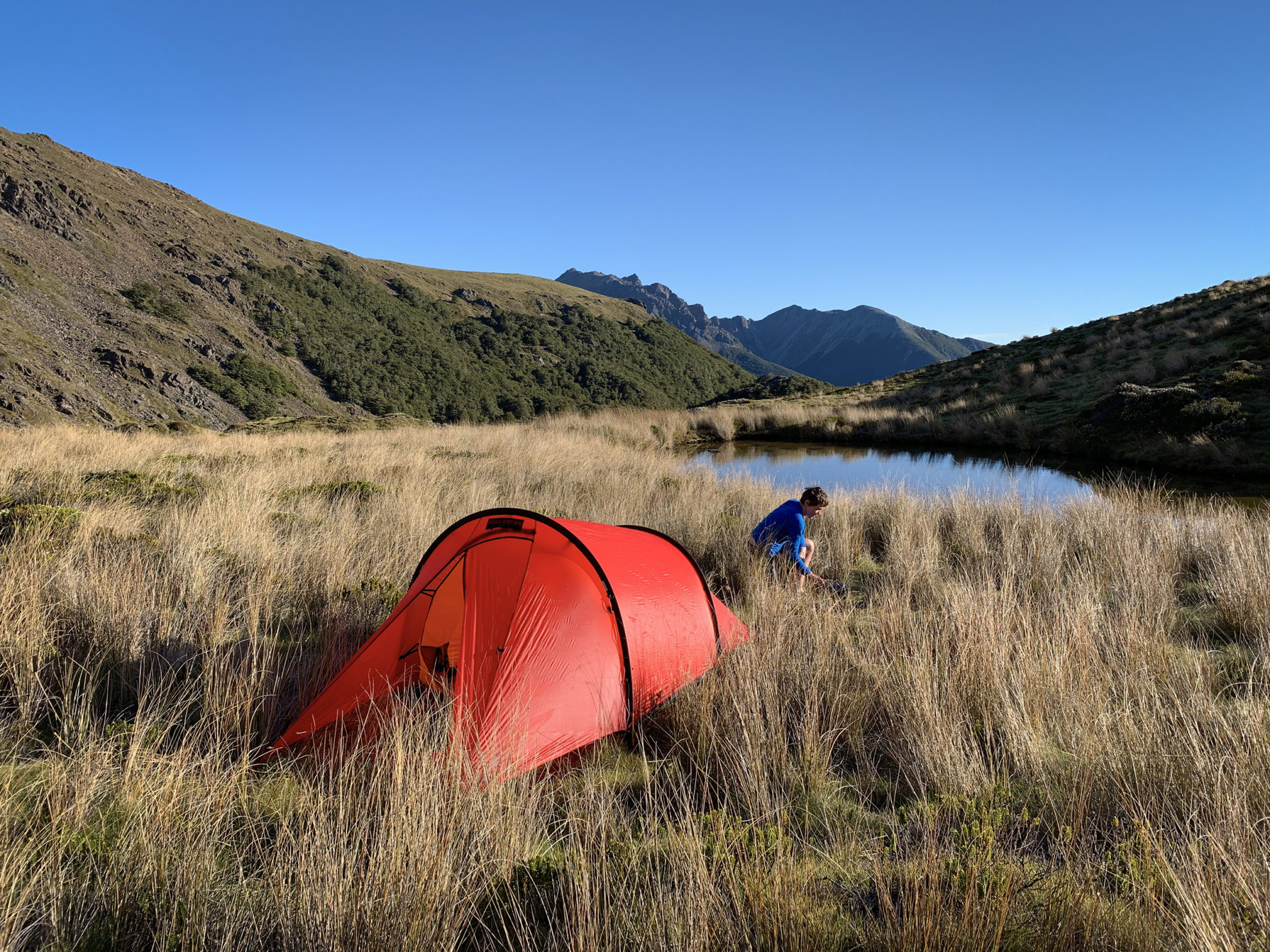 It’s not quite lunchtime. We have a swim, some cheese and crackers and a cup of tea, sunbathing and perusing the hut books. There’s a shag playing on the tarn to remind us that despite the feeling of mountainous isolation, we’re still close to the coast. As we’re launching into our third brew, the arborists appear on the saddle and we try to decide whether to put in a few more hours or stay put.
