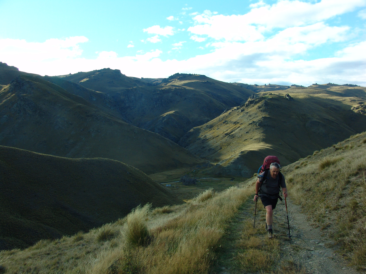From the hut, the track got more interesting. No more were we on a farm track; we were on a ground trail worn down by miners 150 years before. We climbed past a water race, and then spent the next while meandering across broad ridges and in and out of gullies. It is really nice country covered in tussocks and tors. An occasional sprinkling of orange-topped waratahs helped with navigation when the track became a little vague, although from a distance it was sometimes tricky telling them from the plentiful Spaniards. Finding your way could be challenging in foggy conditions or in snow. The promised nor’wester didn’t really make much of an appearance and the threatened showers were mercifully absent.
