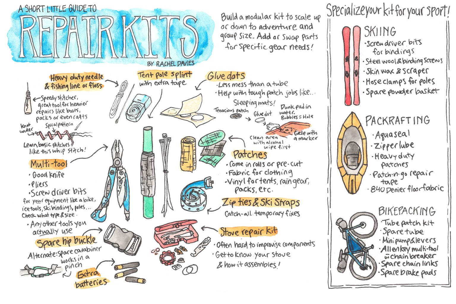 Screwdriver bits for bindings; steel wool and binding screws; skin wax and scraper; hose clamps for poles; spare powder basket.