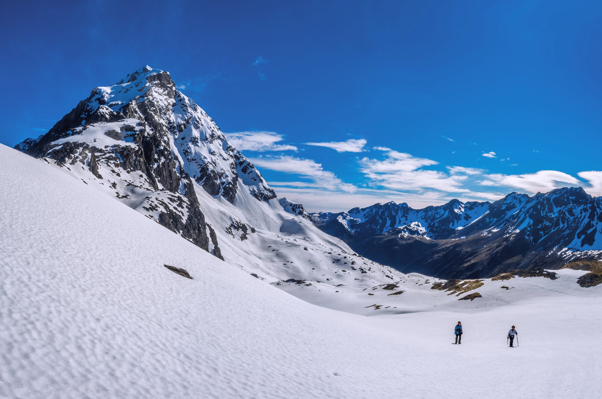We’d been tentatively plugging upwards, out of the dawn, towards Mt Travers’ north-east ridge. There had been no freeze overnight and, nagging at the backs of our minds, was a deteriorating weather forecast.