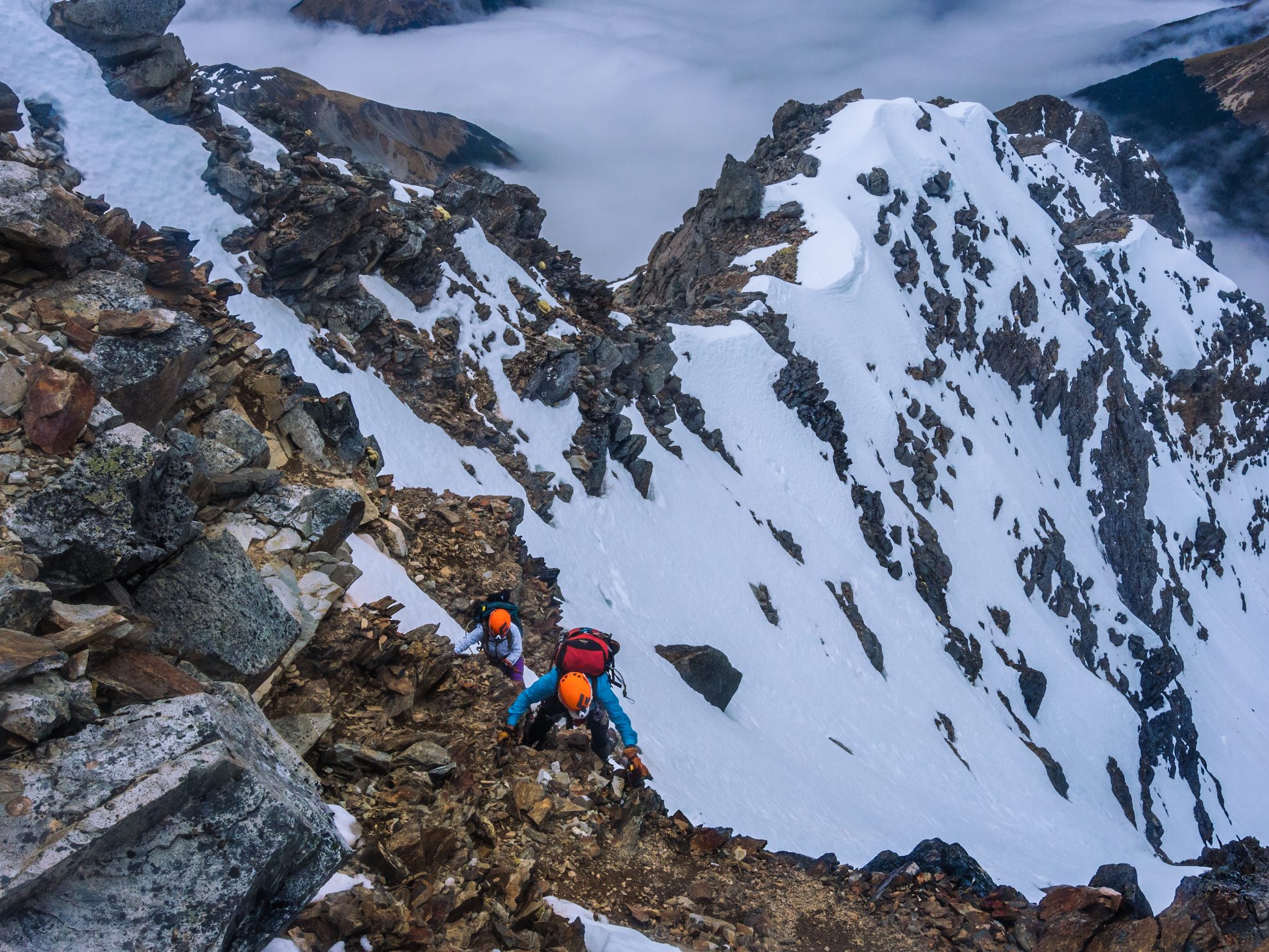 The snow was a problem – while the steps we kicked as we pot-holed upwards were deep, they sometimes gave way without warning. Our route took us up steep, exposed snow slopes, interspersed with stretches of shattered rock. Our ropes remained in our packs because there were no possibilities to put in solid protection. Our axes were really only good to aid balance – successful self-arrest was unlikely.
