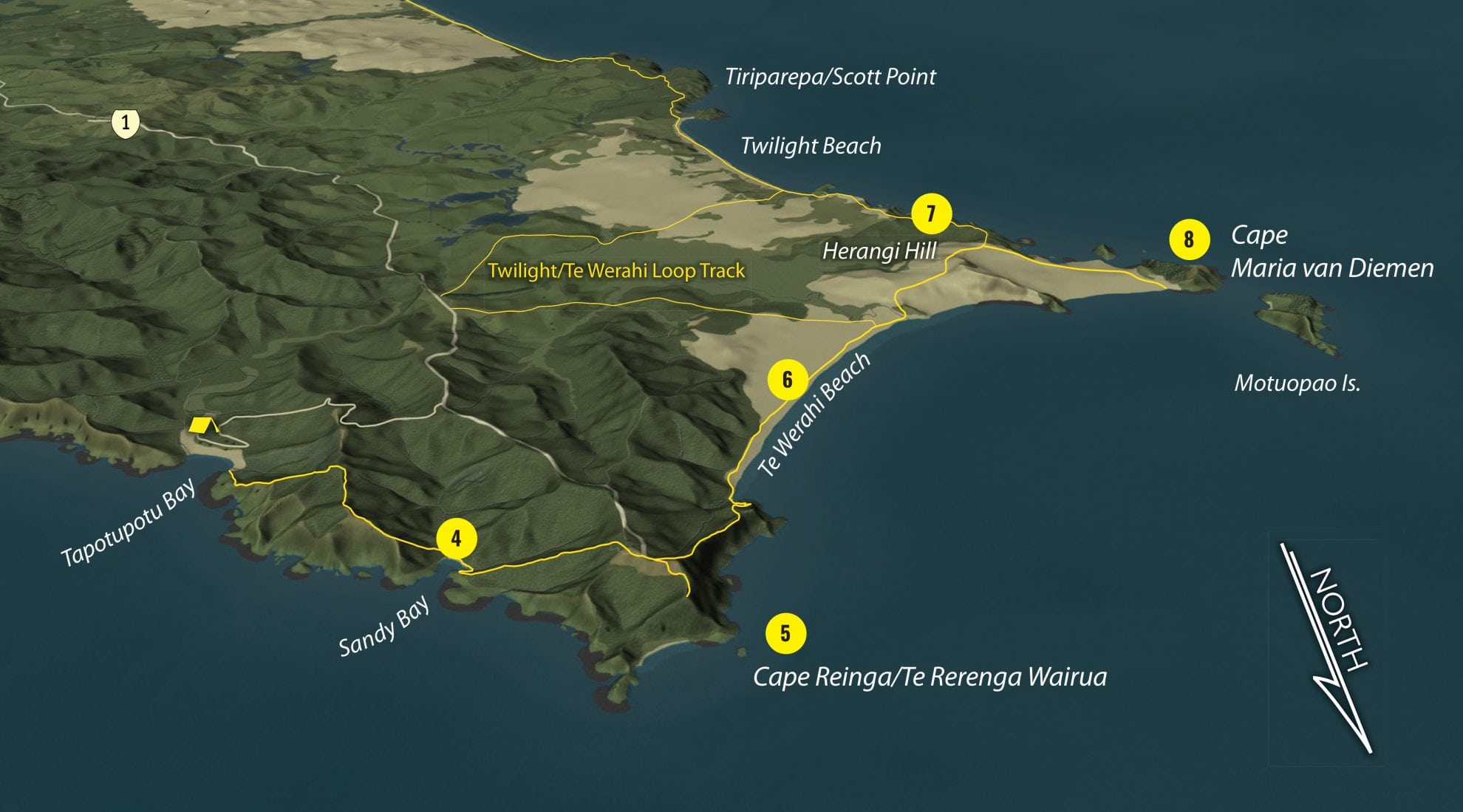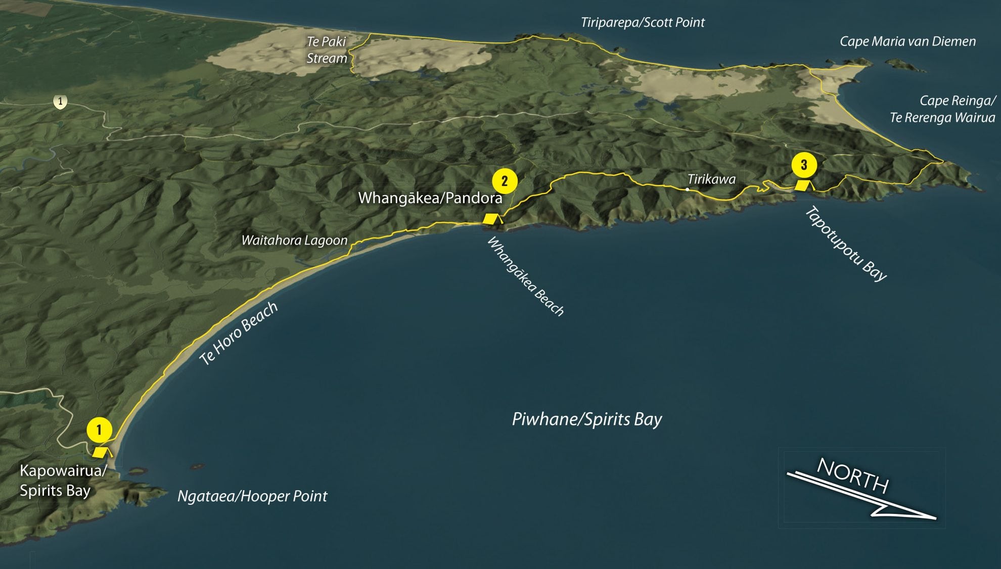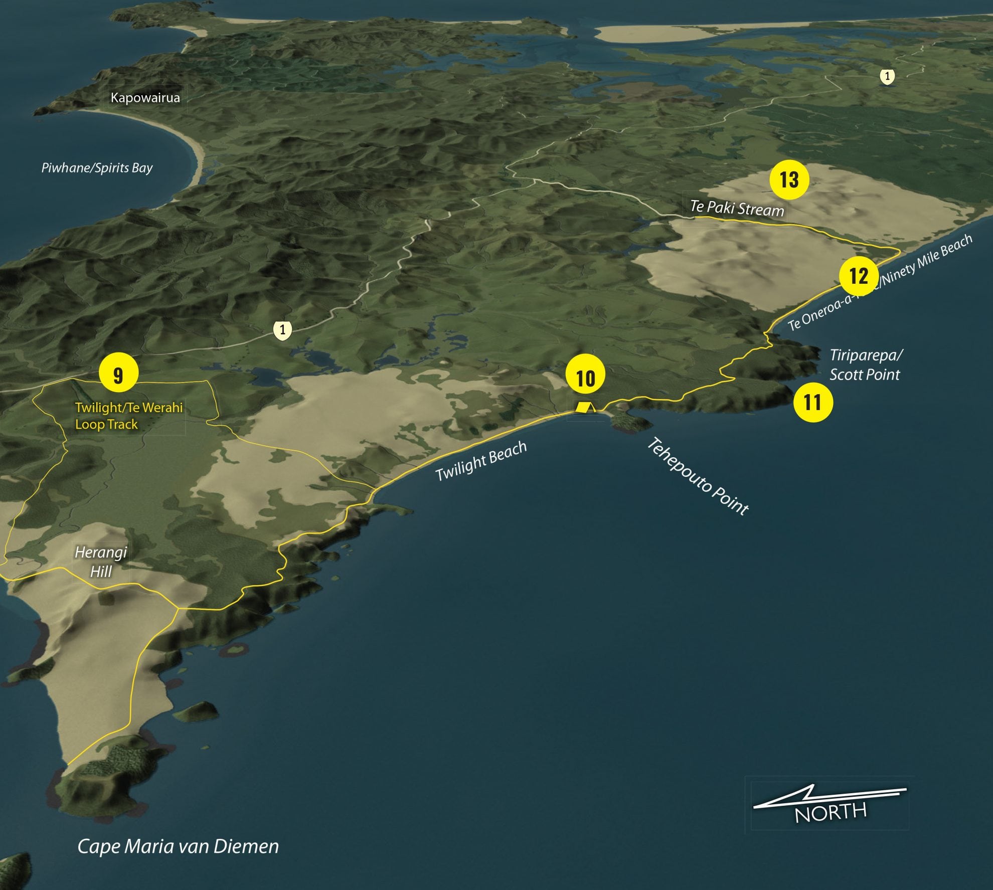 The 44km Te Paki Coastal Track begins at Kapowairua/Spirits Bay, traverses around Te Rerenga Wairua/Cape Reinga, and south-westwards to Cape Maria van Diemen, before swinging south-east to reach Ninety Mile Beach. It ends at the sand dunes of Te Paki, some of the country’s most extensive. Of course, since 2011, the track has become the start of the Te Araroa Trail, now completed by hundreds of people every year.