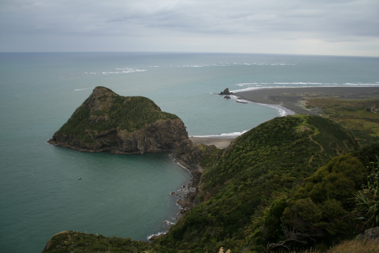 Two wooden platforms – one at either side of the summit – give contrasting striking views. One points south-west towards South Head. Apparently, on a very clear day, you can just make out Mt Taranaki on the horizon. The other platform looks north-east over the Manukau Harbour with what looks like a miniature Auckland city in the distance. The Sky Tower looked like a tiny syringe, two bumps to its right must have been Mt Eden and One Tree Hill, and behind these features was the molehill of Rangitoto.