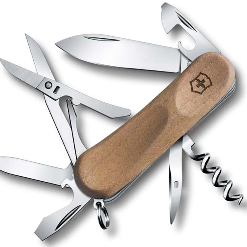 Here are all the tools needed for everyday adventures, fixed between specially formed wooden scales