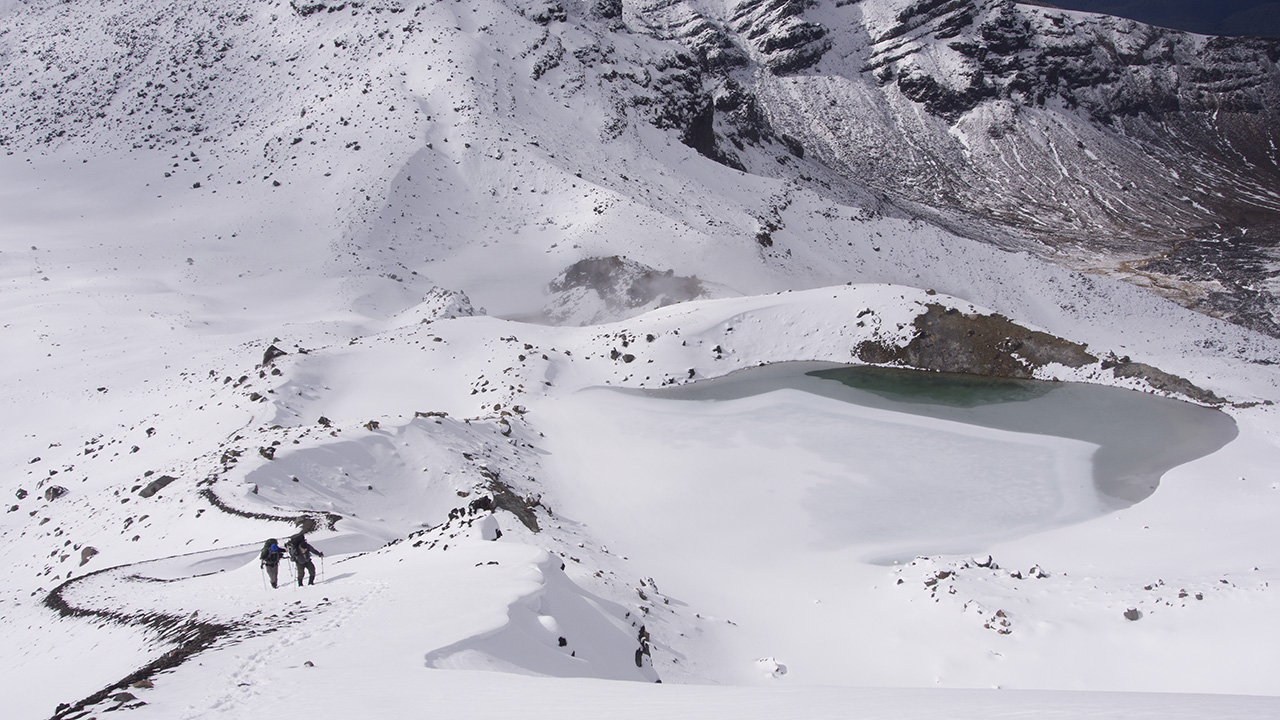 The winter route is essentially the same as the summer crossing, but minor route modifications may be needed depending on the snow conditions. You’ll also need crampons because while snow is rarely encountered at the lower altitudes of the two road-end car parks, it lies thick on the ground above the Ketetahi Shelter and Devils Staircase.