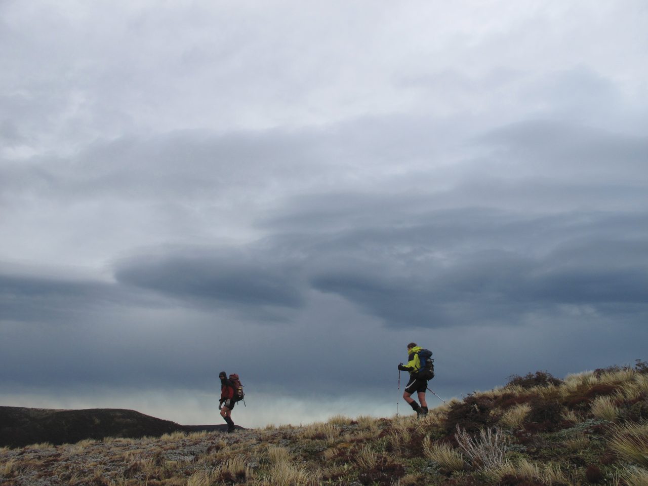 A climb delayed is never a climb avoided and the next day we ascend Totara Spur. Unsurprisingly, totara is a feature of this spur and it is an extremely pleasant climb. The tops above Totara Spur are broad and rolling and very easy tramping, although they can be a little confusing in the mist. The weather deteriorates and we quickly don jackets and marvel at the cloud formations.
