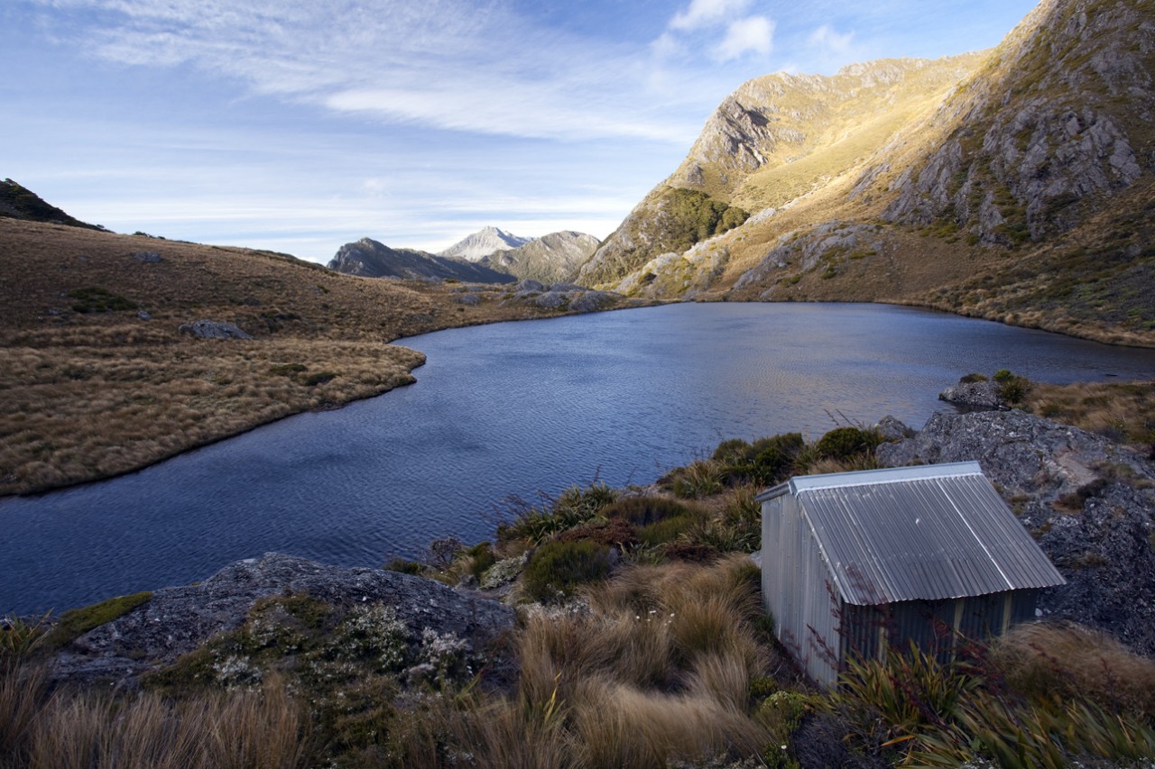 The easiest route is from the Aorere Valley, over Boulder Lake Track then up Arena Creek to Green Saddle. From here, a well-cairned route sidles south. This ground trail punches through tight scraps of bush, popping out onto sharp ridges which feature unusually-angled rock tors. Slipping through a rock gut named The Needle’s Eye, you will see the lake below.