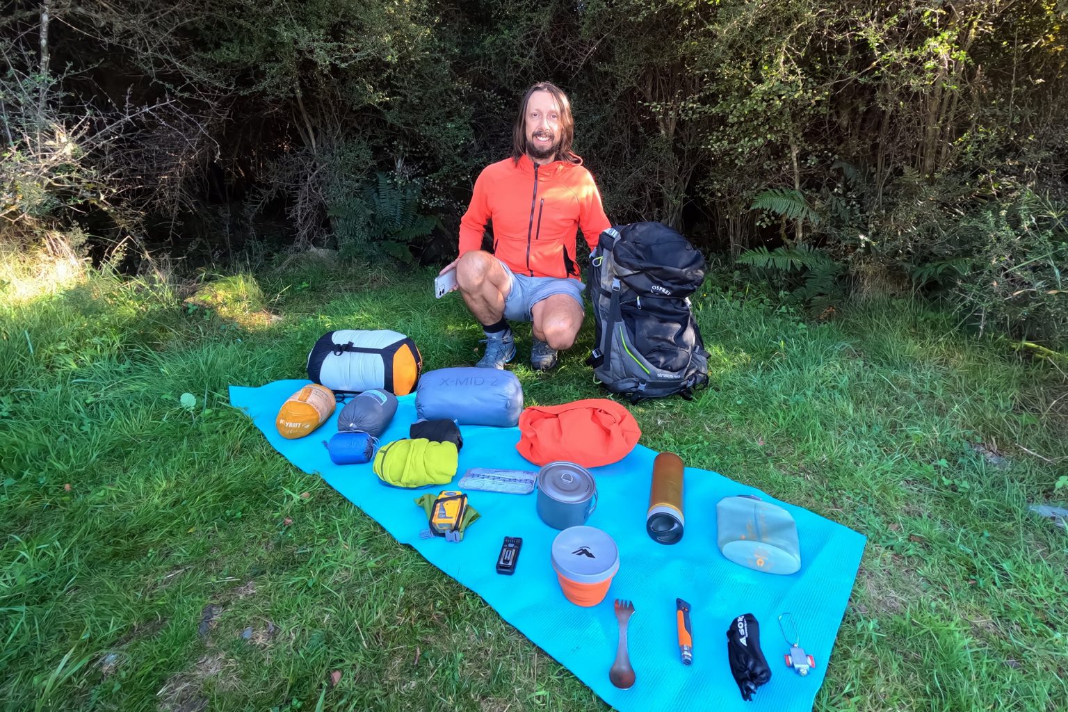 My Osprey Stratos 50 is comfortable and large enough to carry the spread you see before me, plus a few days’ worth of food.