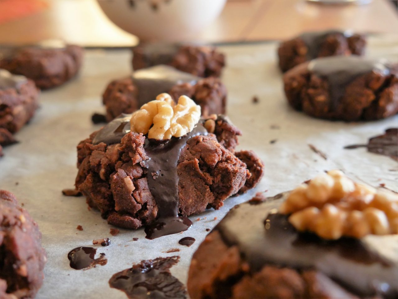 Remove cookies from oven and allow to cool before topping with a heaped teaspoon of icing and a walnut half. Store in airtight container for up to a week.
