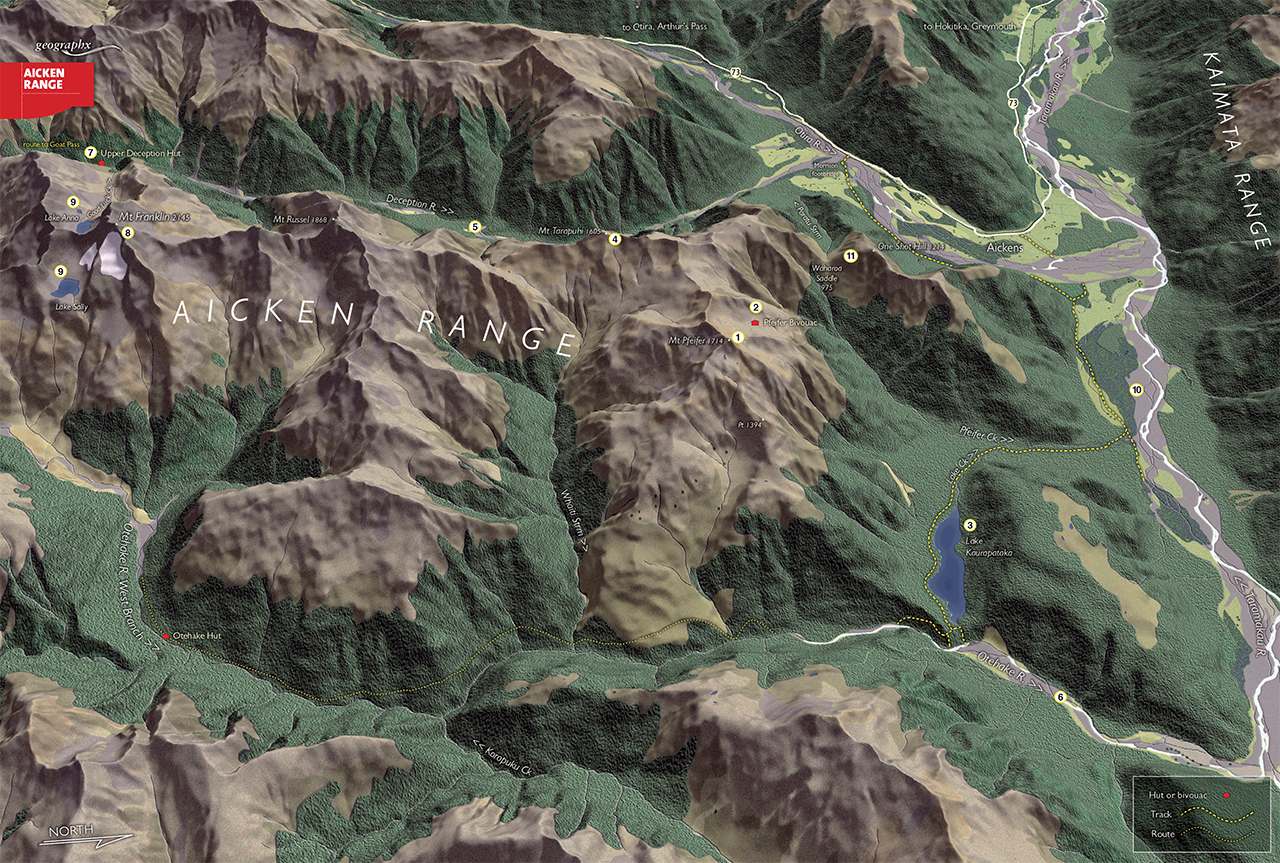 Lying in the heart of Arthur’s Pass National Park, the Aicken Range runs due north from its intersection with the Main Divide near Goat Pass to fan out into two large sub ridges protruding eastwards into the Otehake catchment. One of these is dominated by the popular Mt Pfeifer, while the other runs east from Mt Russel and has no named summits but several moderately high peaks.
