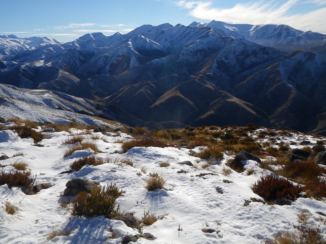 The summit supports more tussock with a few larger rocks big enough to stand on for an extended view along the Alford Range into the alpine peaks beyond. Mt Alford seems inviting, although offering more difficult and technical alpine routes that wind through the rest of the Canterbury side of the Divide.