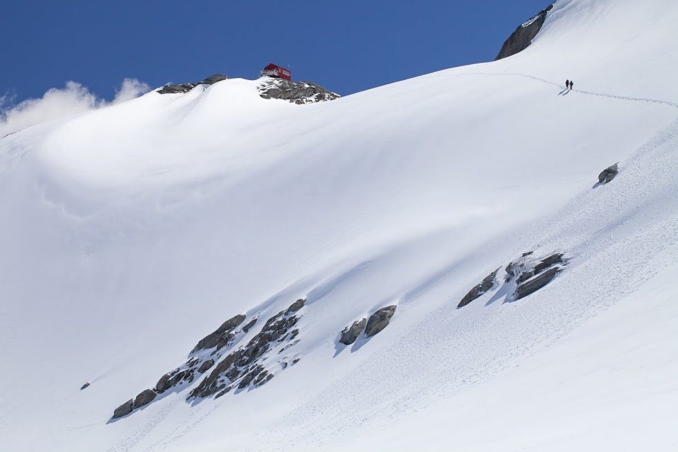 After waiting out a storm for several days, a guide and his client approach Colin Todd Hut in glorious conditions. Perched at 1,800m on Shipowner Ridge, just 300m below the junction with the NW ridge of Mt Aspiring, this location offers spectacular views across the Bonar Glacier, out to the Tasman ocean, and of course Mt Aspiring itself. The grand sense of scale, remoteness and inhospitable feeling that one gets up there is also wonderful.