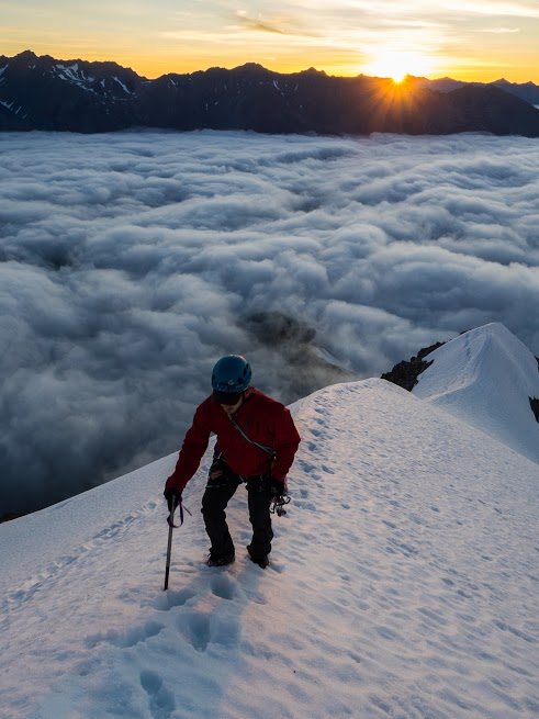 We began our climb of the south-east ridge of Boanerges, 2254m, in Ruataniwha Conservation Park, in the early hours. We broke through the low cloud, and the rocky ridge gave way to snow just as the sun began to rise.