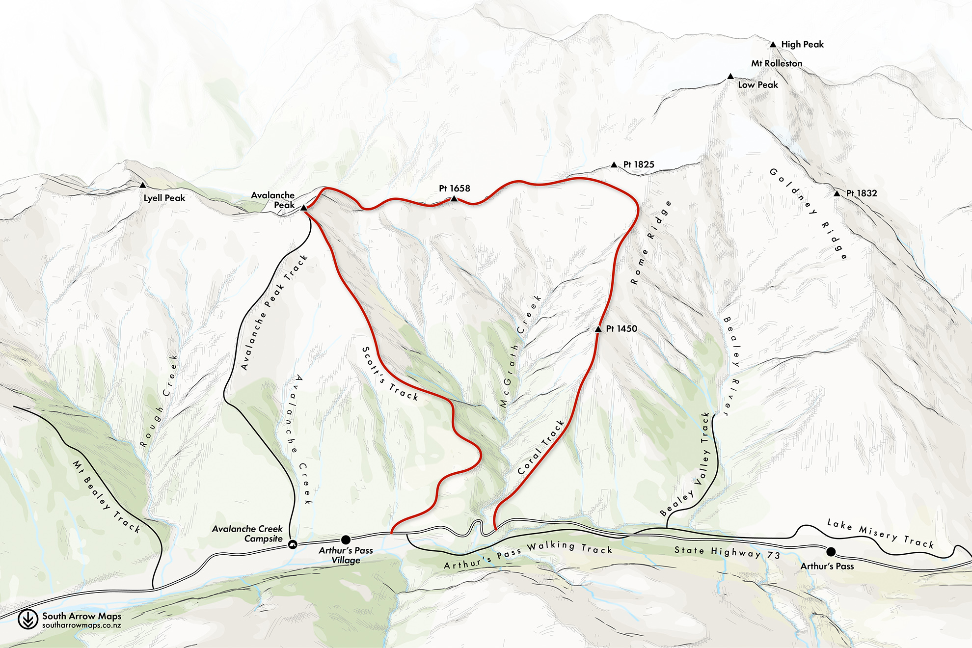 In the steep country around Arthur’s Pass, Avalanche Peak is the area’s most popular alpine day trip. In summer, trampers use the Avalanche Peak and Scotts tracks to reach the summit. A more difficult but spectacular loop starts on Coral Track, a bit to the north of the township, traverses a knife-edge ridge to the peak and provides superb alpine views in every direction.