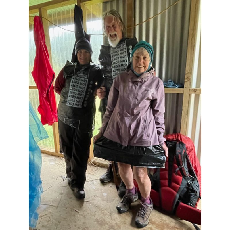 I’d like to add to Catherine Holmes’ letter extolling the virtues of tramping in a skirt (Pigeon Post, July 2024): the rubbish bag rain skirt! Take a black rubbish bag with ties at the top. Cut to length required. Voila! Costs just a few cents, weighs virtually nothing and is always a talking point and much admired. And it will keep your tramping skirt – or shorts – dry.