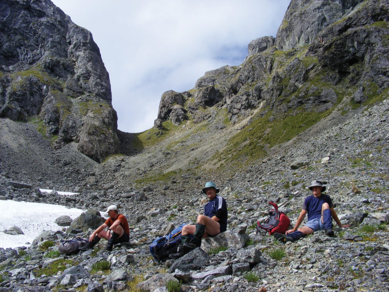 When the vegetation started to thin out, we had our first view of Mt Ngatimamoe, an impressive rock pyramid. Soon, we were out of the bush and negotiating flats sprinkled with boulders and scrub that slowed our travel. A left turn took us into the major tributary of Mistake Creek and our first view of the infamous waterfall. A bit of boulder-hopping upstream brought us close to the base of the fall. Moirs describes two routes – one on the true right requiring ‘care and confidence’; the other on the true left described as ‘a natural rock staircase [which] provides easy if highly improbable travel’. We chose the latter, although two of us found one move (assuming that we were on the route) to be more at the highly improbable end of the spectrum than easy. With that out of the way, we progressed through more scrubby boulders – or boulder scrub – to the lip of the hanging valley above the falls. This gave us our first look at the pass as well as a sighting of some chamois frolicking across some old snow at the head of the basin.