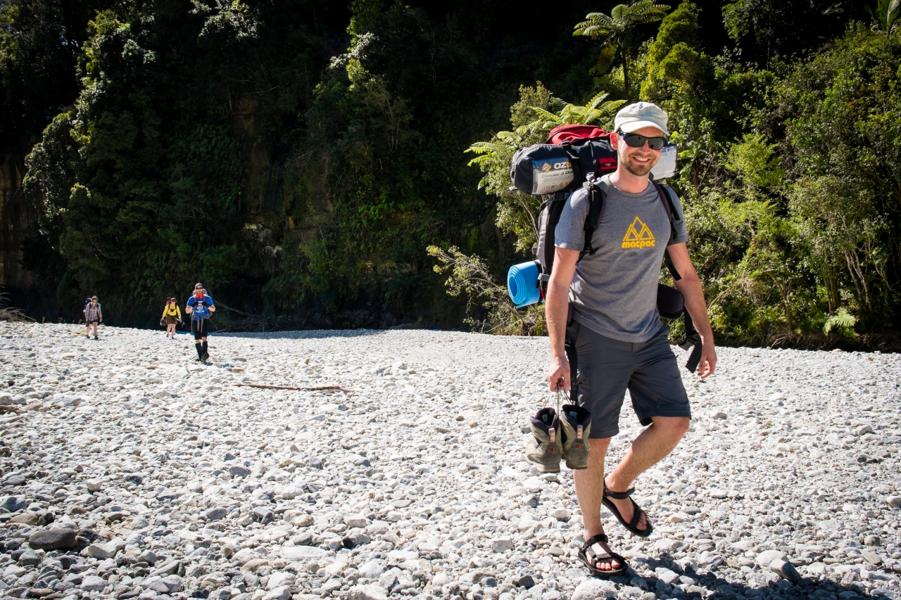 An easy track follows the true right of the lower Fox River for a while before we were getting our feet wet for the first time. For trampers looking to visit Ballroom Overhang, wet feet are an integral part of the experience. River crossings are numerous, but luckily for us the water was warm enough for a few quick dips.