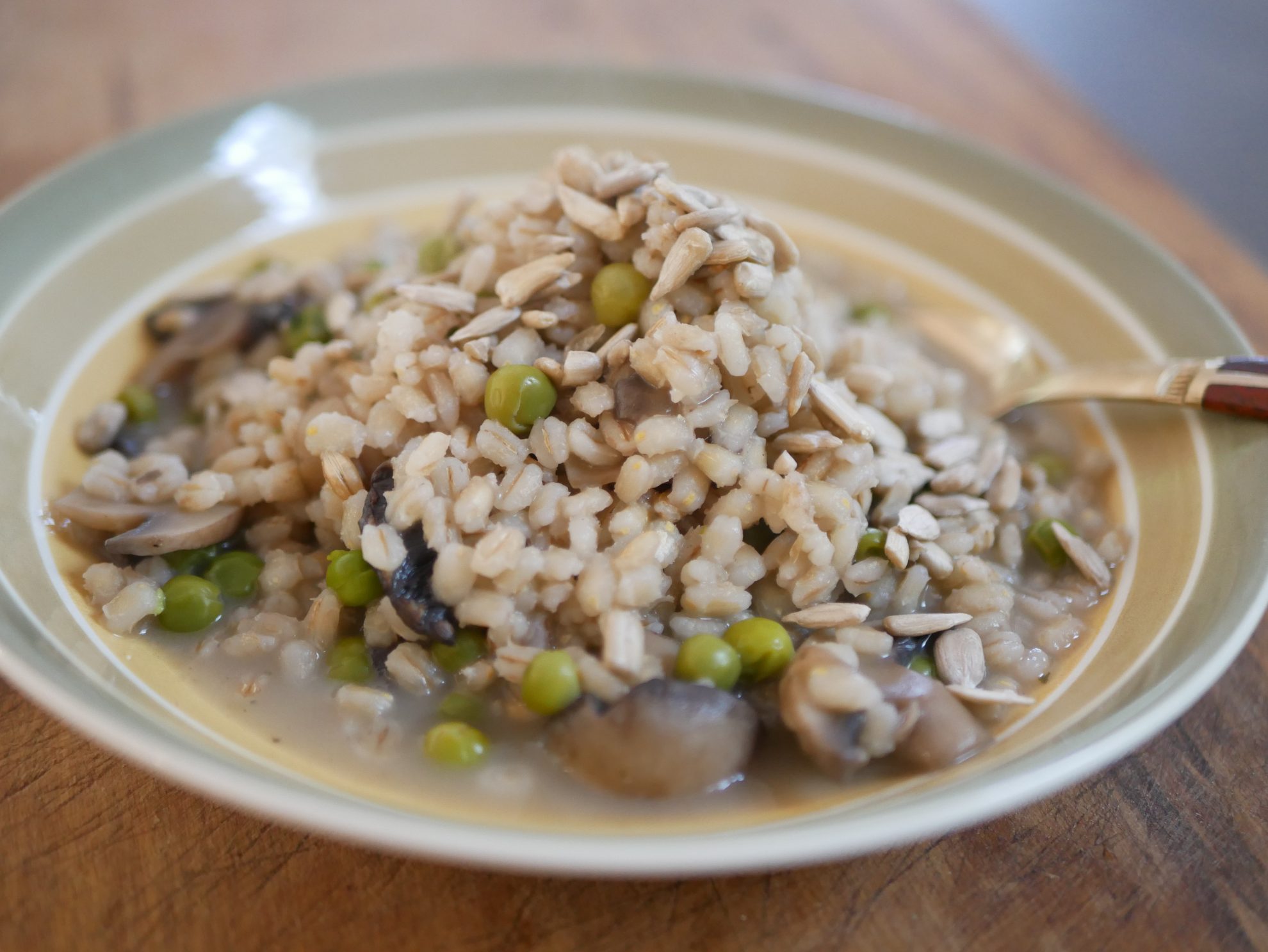 Sauté onion with olive oil in a large pot for two minutes, add garlic, barley and bay leaf and cook a further two minutes. Add four cups of water, veggie stock, mushrooms, and peas and bring to a simmer. Cover and cook on low simmer for 30-40min, stirring regularly until most of the water is absorbed. You want the barley to be tender but still have a slight bite. If the mixture starts to stick or look a bit dry, add extra water. Taste and add salt and pepper. Remove from heat and top with sunflower seeds to serve.