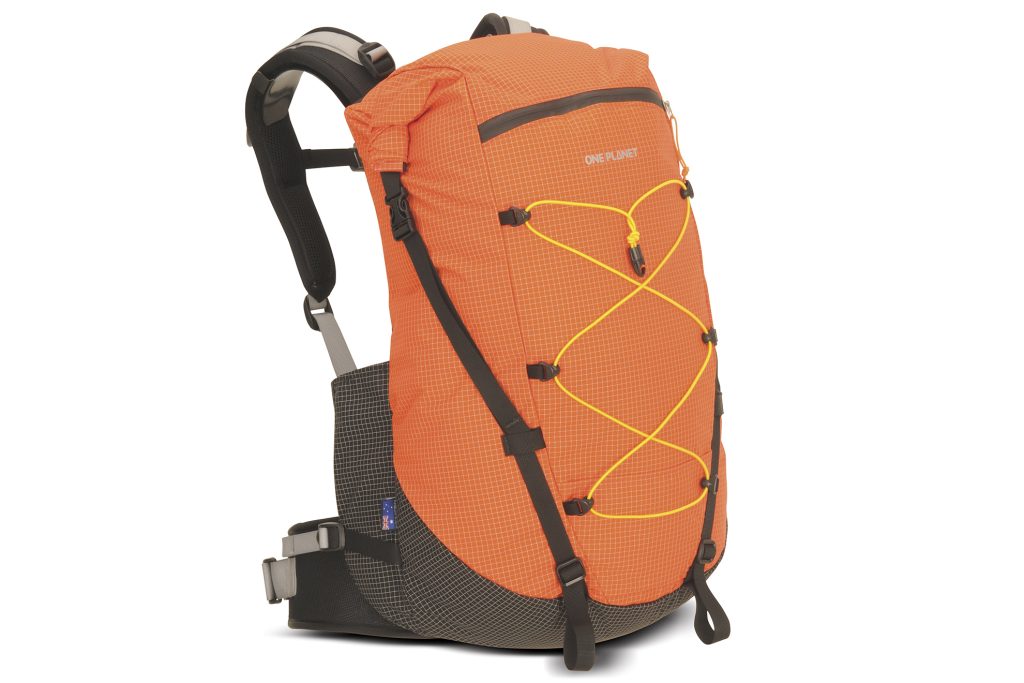 This pack has a roll-top closure and removable bungee and compression straps to trim overall weight. It has a compact, supportive and ventilated Exact Fit Mid Lite harness, a hardened aluminium frame, walking pole attachments, water bottle pockets and it’s hydration compatible. Made in Melbourne. Fabric 210D Diamondloc nylon with UHMWPE ripstop grid Capacity 50l Weight 1200g. www.oneplanet.au