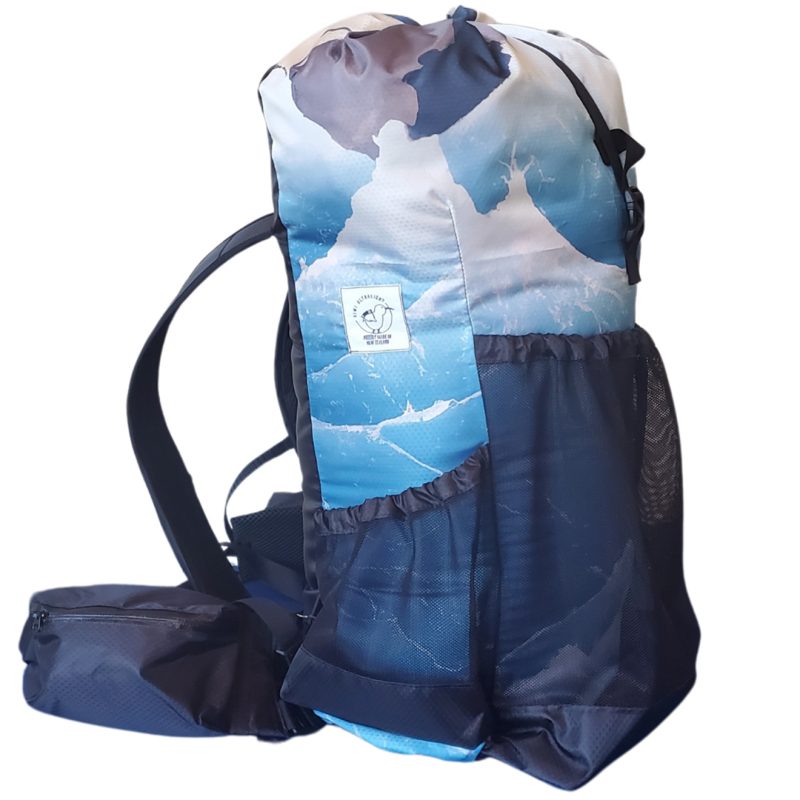 A New Zealand-made pack, among the lightest in the world, designed for fast and light trips where ultralight gear is carried. It’s frameless, has seven external pockets, roll-down closure, adjustable and removable hip belt (120g) to lessen pack weight, and comes in a variety of coloured patterns. Fabric HyperD 300 polyester Capacity 42L Weight 300g + 120g hipbelt. www.kiwiultralight.co.nz