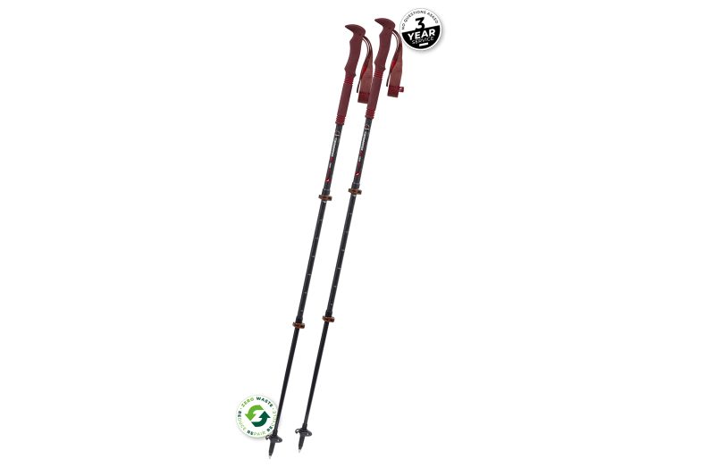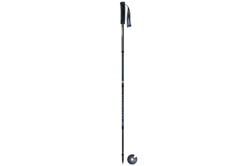 A lightweight, fixed-length carbon pole. It has an ergonomic cork grip with a 5-degree tilt to reduce fatigue, recycled ‘Bloom’ grip extensions with airmesh padded straps, and 4-season flex tips with trekking and snow baskets.