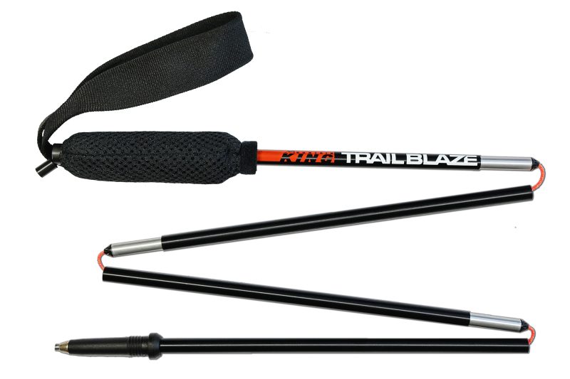 A lightweight foldable pole in five sections designed for fast-paced activities like trail running. It has a short grip and ultralight webbing strap, a carbide tip, screwed baskets and push/pull system for quick deployment.