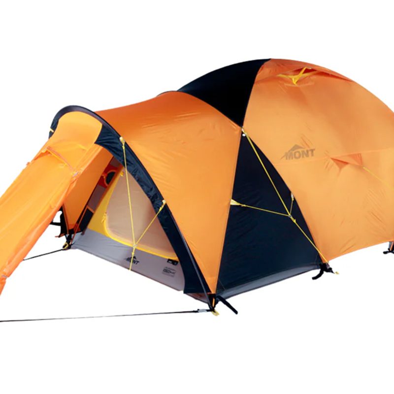 A high-altitude, four-season expedition tunnel tent designed to withstand high winds and snow loading. It has two doors and vestibules, three internally accessed roof vents, 10 pockets, seven guy cords – including four 3-point attachment guys – mesh gear loft, and it’s fully seam sealed. Fly 40D ripstop nylon, 2000mm+ Inner 20D ripstop nylon Floor 40D laminated nylon, 25,000mm Poles 5 Ceiling height 110cm Area 3.08m², vestibule 1.88m² Weight 3750g. www.mont.com.au
