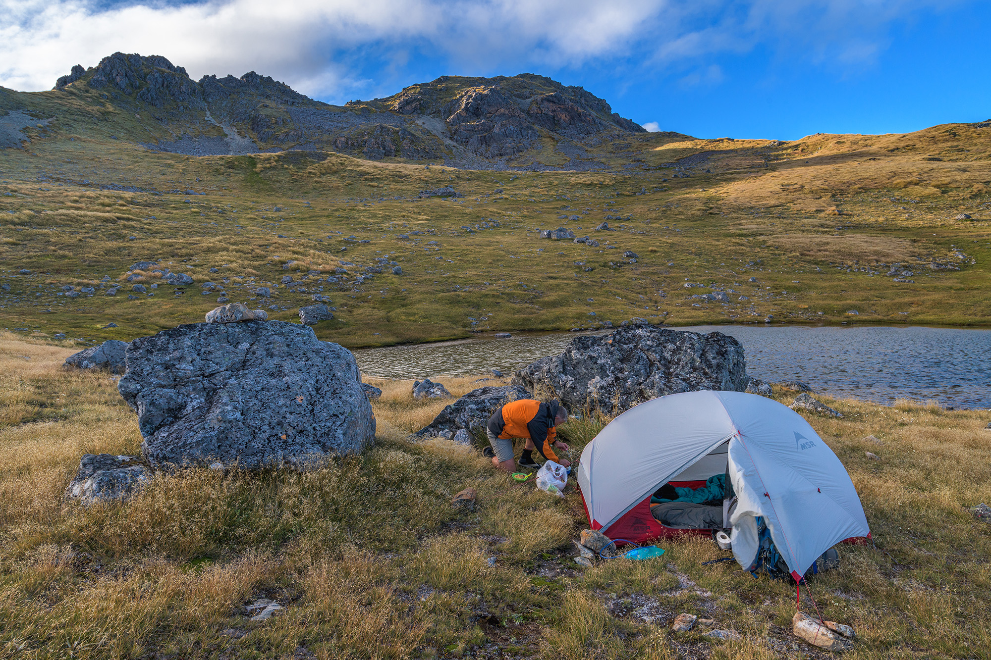 The ground trail petered out, but sporadic cairns led onwards and we followed them on a sidle beneath bluffs and up to The Apprentice. Below lay glistening tarns in the headwaters of Lucretia Stream, where we set up camp as the wind picked up and scudding clouds came racing over. A sudden gust just about snatched the tent from our hands, and we had to shelter the burner behind boulders to cook dinner.