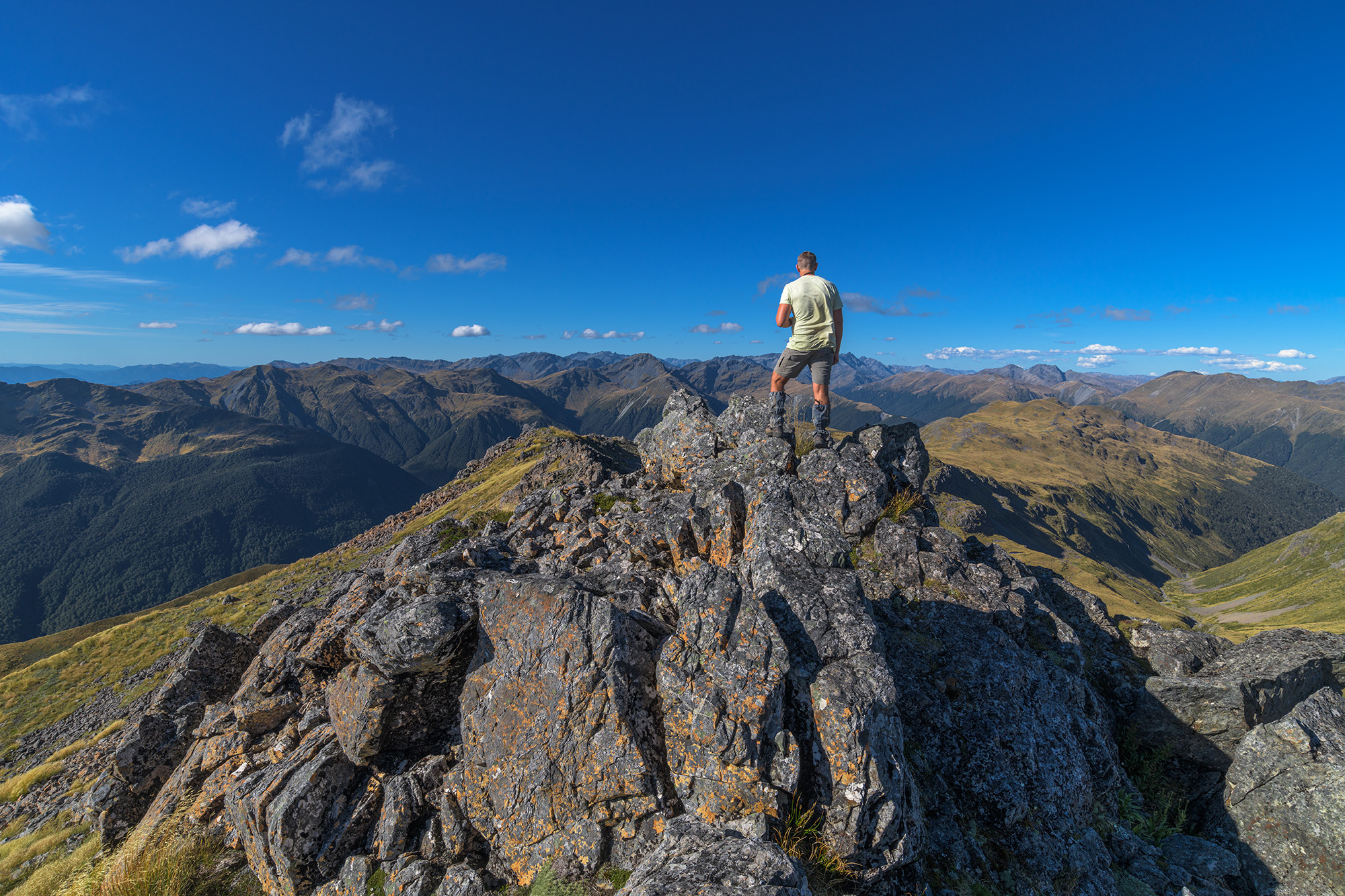 The weather played the game, at first, and in high temperatures we tackled the brief ascent through the stunted beech forest above Lewis Pass. After breaching the bushline, and reaching the first knoll, range after range came into view, revealing more peaks than you could point an ice-axe at. The Spenser Mountains, the Victoria Range, Travers Peak, the Opera Range and Philosophers Knob.