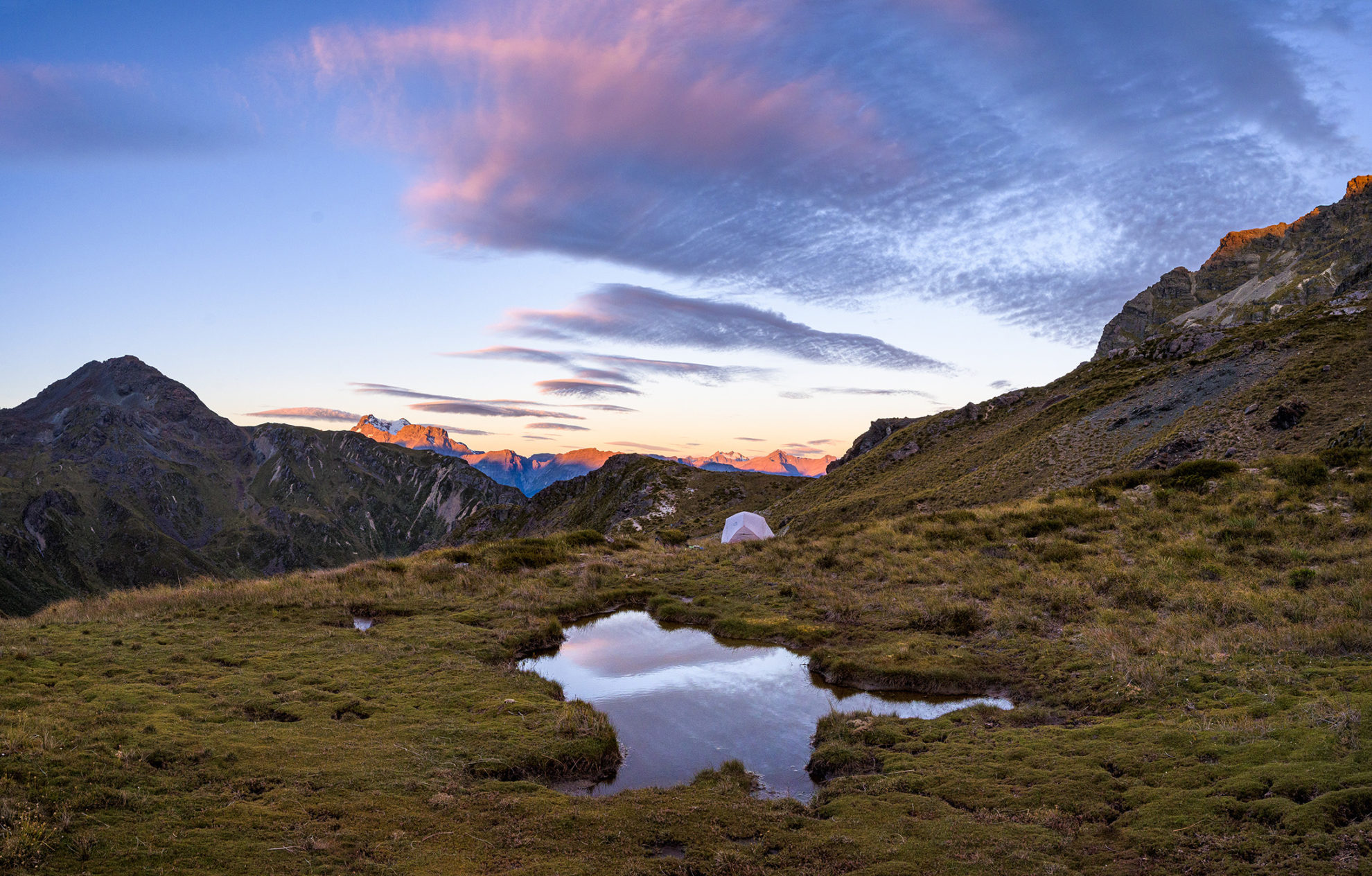 Despite starting after 4pm, it had been a hot, sweaty climb up the steep Scott Creek Track from the Routeburn Road, crossing scrubby farmland at first, but with frequent views of the formidable Pikirakatahi/Mt Earnslaw rising above the Dart River. The mustering hut that once existed on the appealing flats in the head of Scott Basin was long gone, and it was tempting to camp there. Above, though, was a grander possibility beside tarns marked on the map. In a final burst of effort in the last of the daylight, we climbed up to them.
