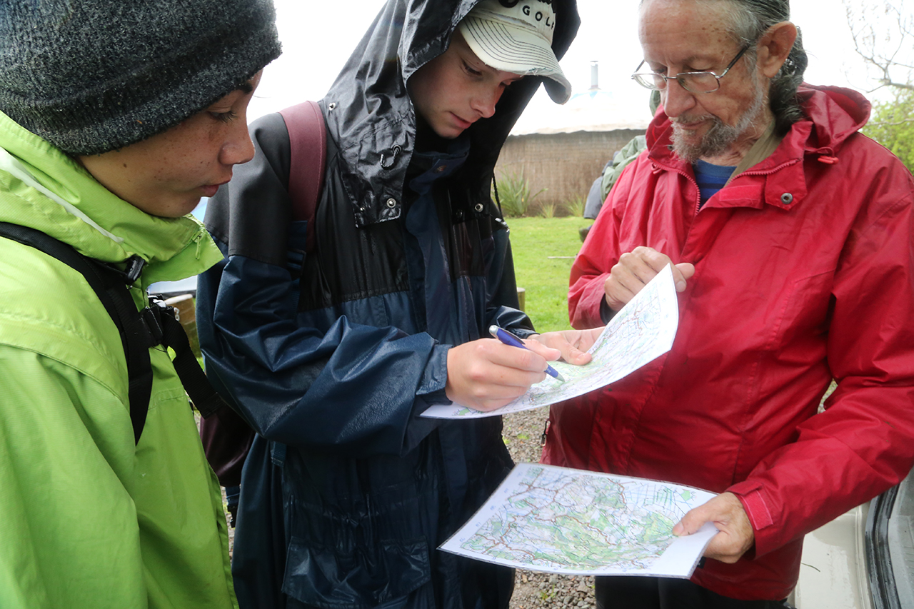 The torrent of rain subsided to a dull roar, so we took the opportunity to hop outside with our maps and compass.