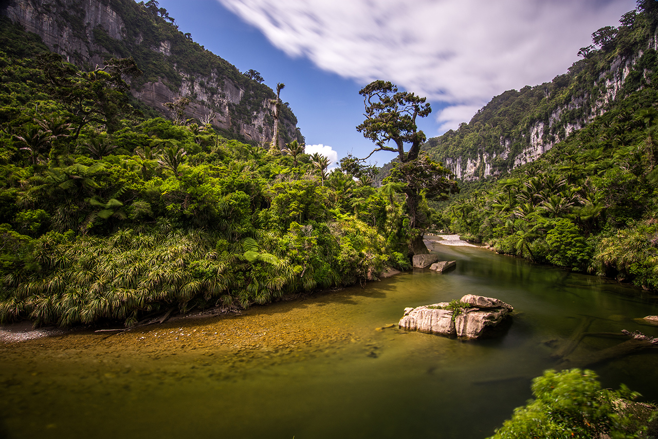 If you’re at Punakaiki and want to escape the crowds at Pancake Rocks, a short walk along the Pororari River Track will do the trick.