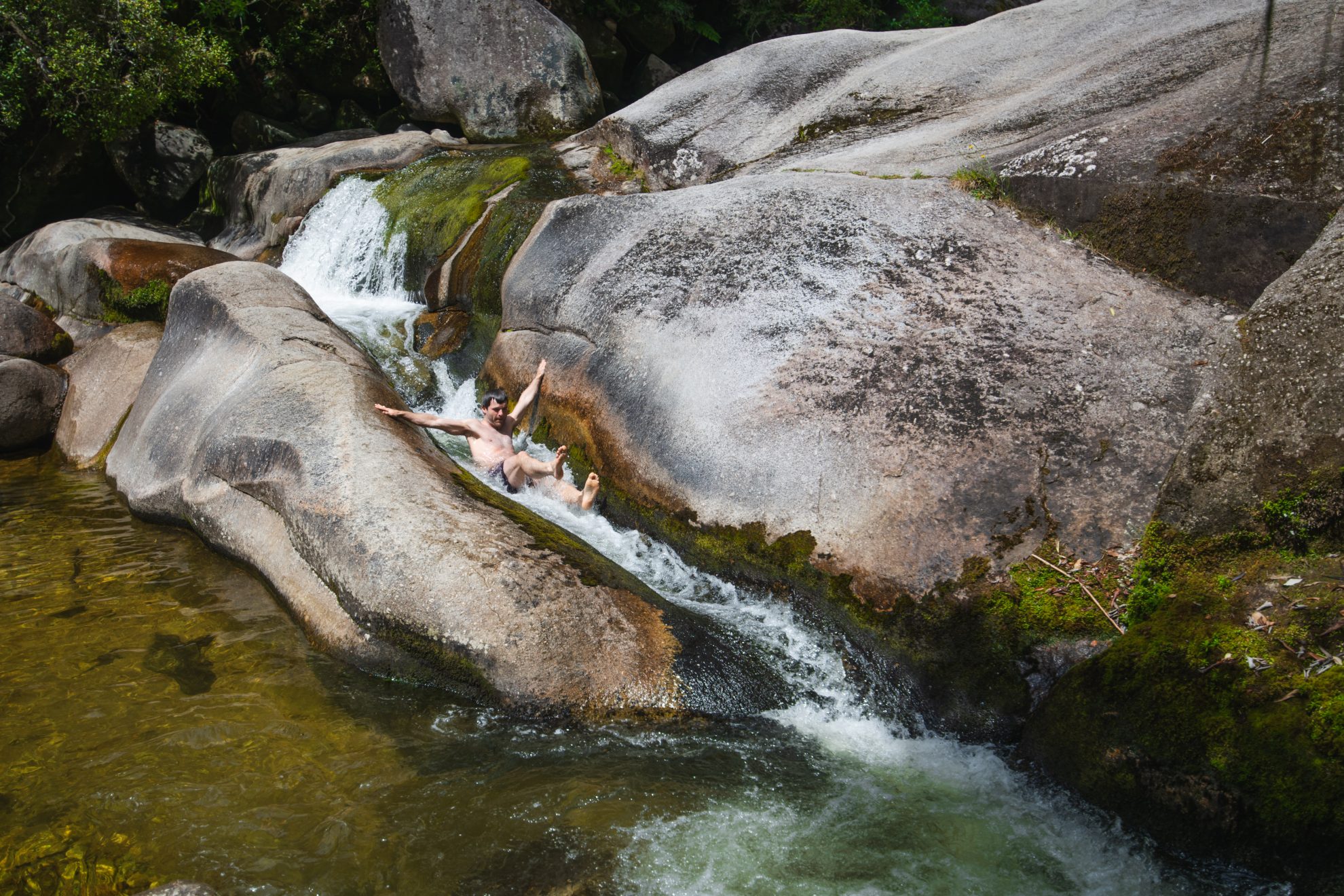 Be careful of sharp rocks surrounding the bottom pool, however. I cut open my sternum here trying to breaststroke away from the falls, and spent the next three days walking topless to keep my shirt from sticking to my wound.