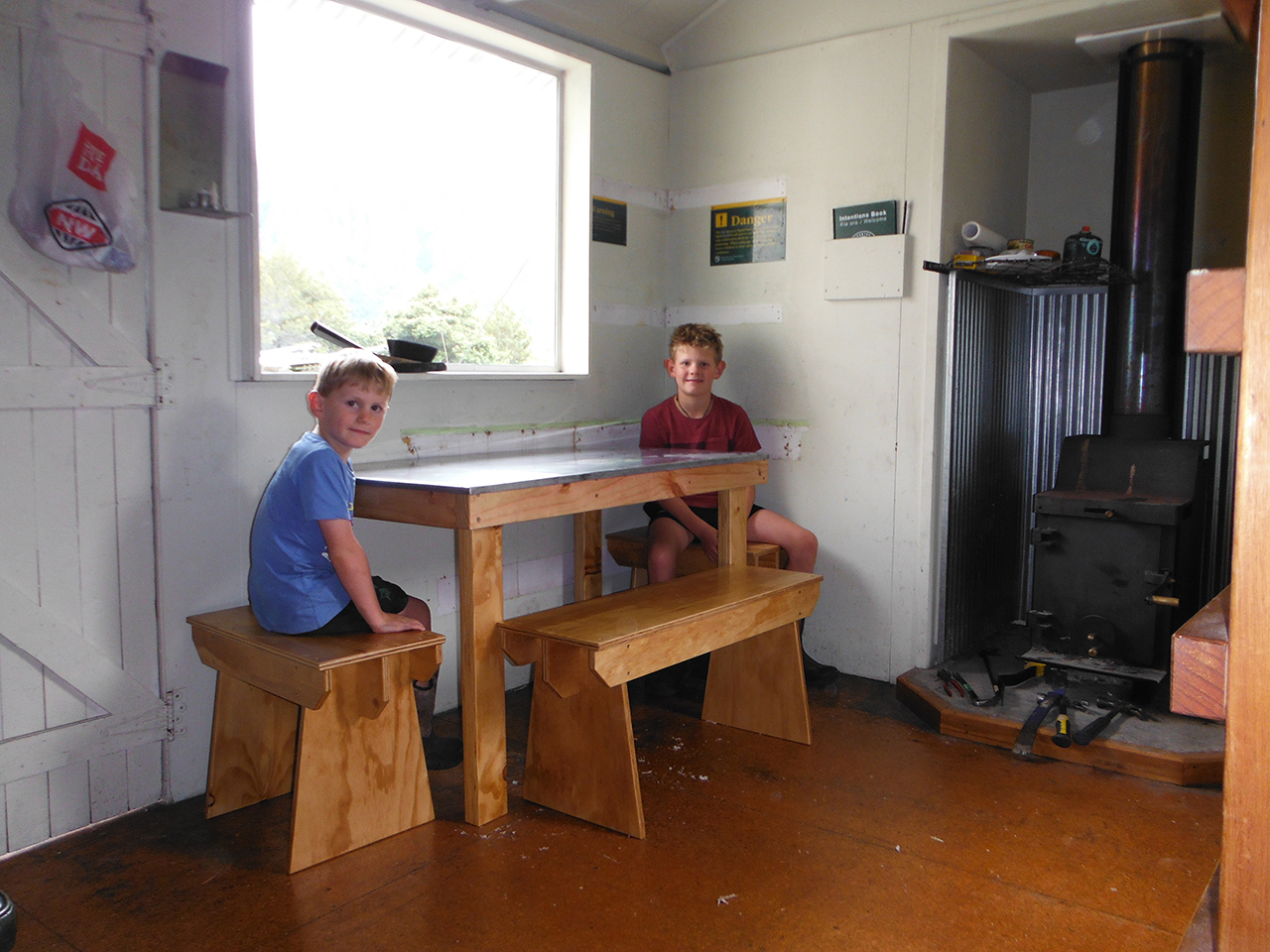 Lagan, together with cabinet maker Zack Bennett and Bennett’s two sons Jack and Oscar (ages 9 and 5), spent a few days installing the new table and bench, and also constructed a woodshed just outside the hut. The work cost $800, which Lagan said was a bargain compared to some hut projects that require helicopter assistance to transport gear, supplies and volunteers.