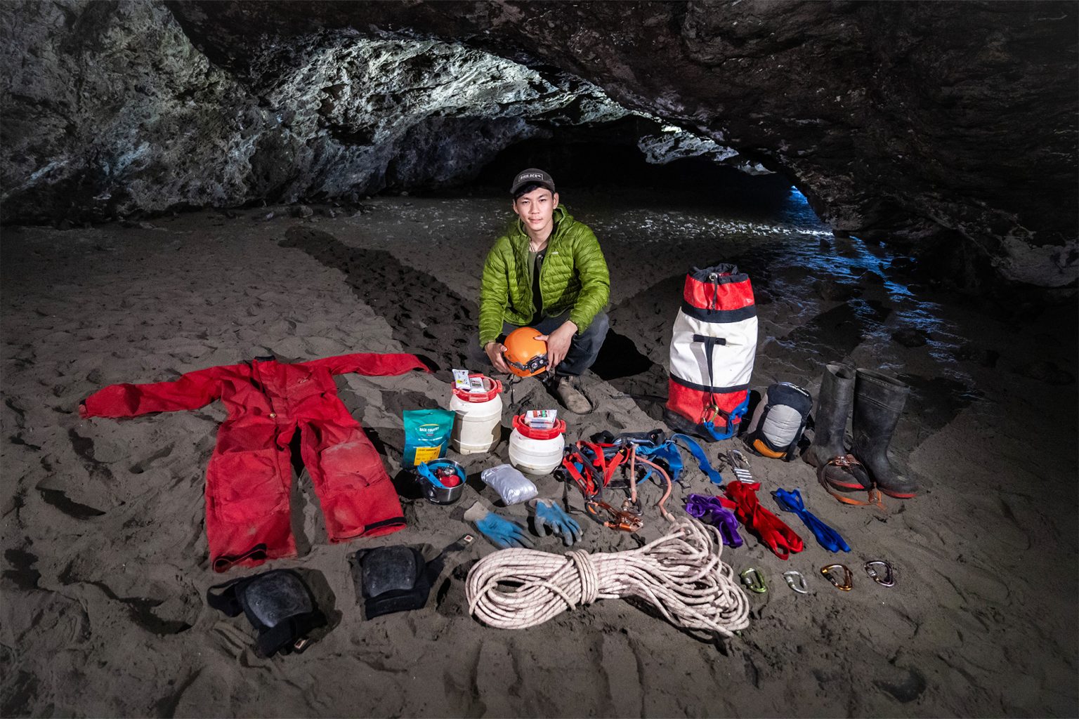 “What I pack largely depends on the objective,” he says. “Major factors include the amount of rope work and rigging anticipated, how wet and cold the cave is, and whether or not it’s an overnighter. Durability is key: our gear needs to withstand being hauled, thrown, kicked and dragged through rock, mud and water.”