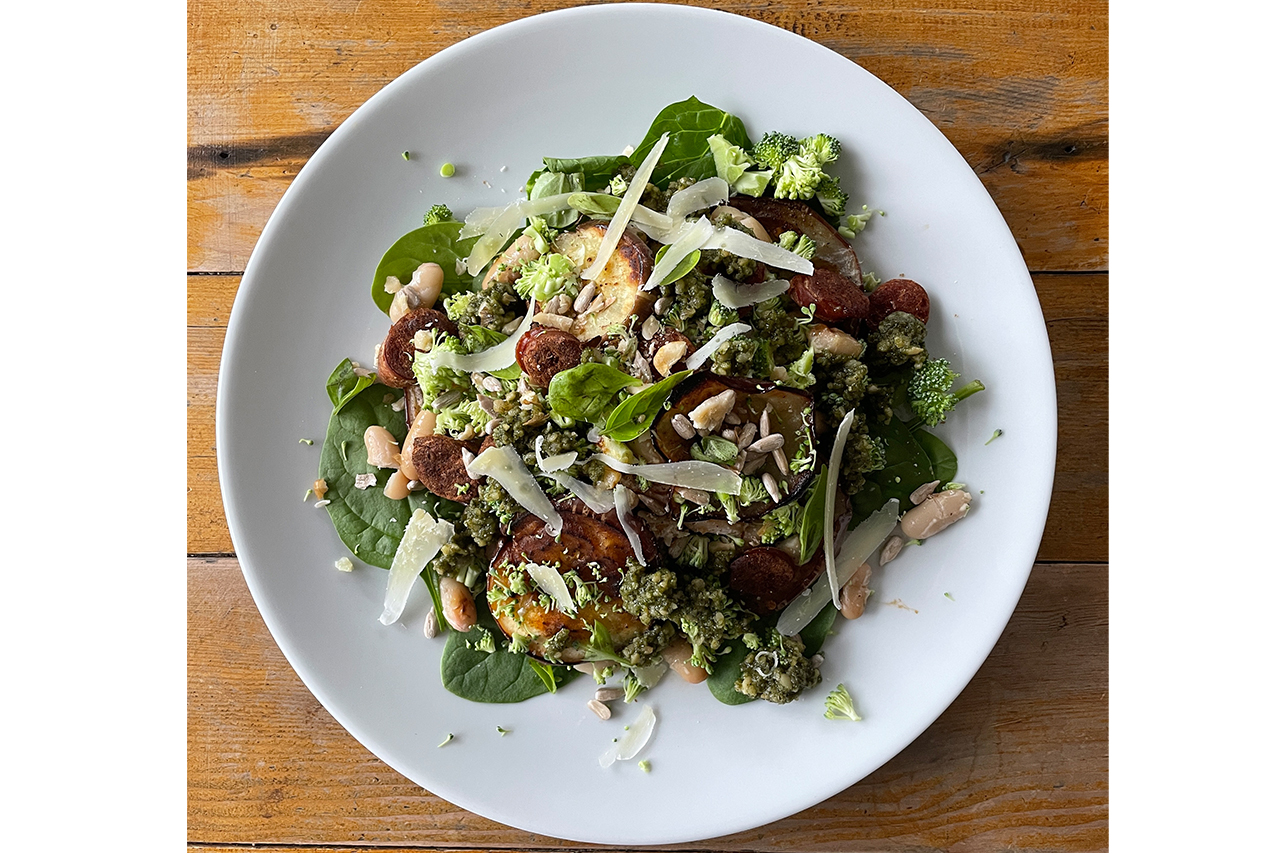 Drain and rinse the can of beans. Slice the eggplant into thick, and the chorizo into thin rounds. Heat oil in a frying pan and add the eggplant, cooking over a high heat for ten minutes until the sides begin to collapse and the centres go gooey. Flip the pieces after five minutes. If there’s room in the pan add the chorizo at the five-minute mark as well. (If not, cook separately once the eggplant is done.) Very finely chop up the broccoli until it’s about rice-sized. Distribute the spinach, beans and broccoli onto plates or bowls and dollop some pesto on top, then stir to combine. Place eggplant and chorizo pieces on top and finish off the rest of the pesto, sprinkling salt and pepper and parmesan over the lot.