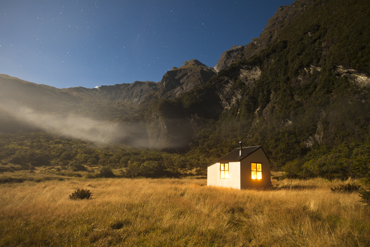 Open flats surround the unique four bunk hut and the river flows over a rocky bed nearby. It’s the perfect place to lie on grass as the sun makes its lazy arc and mist rolls over Karangarua Saddle far above.